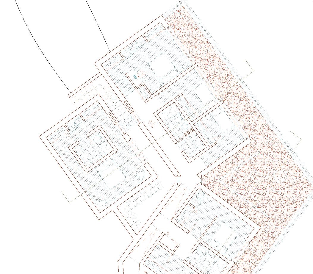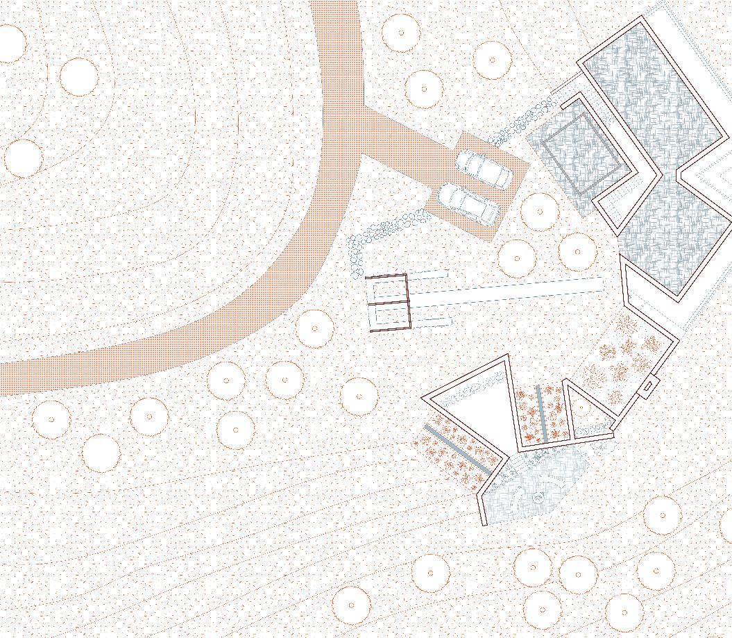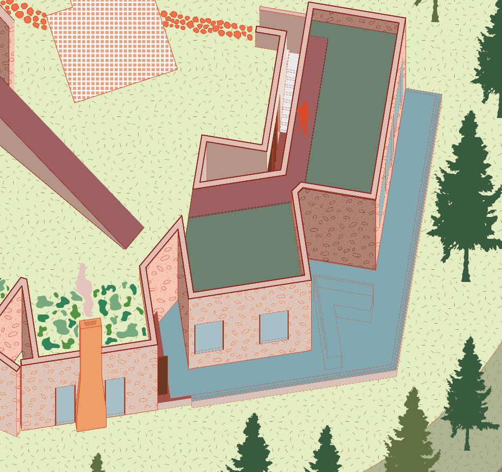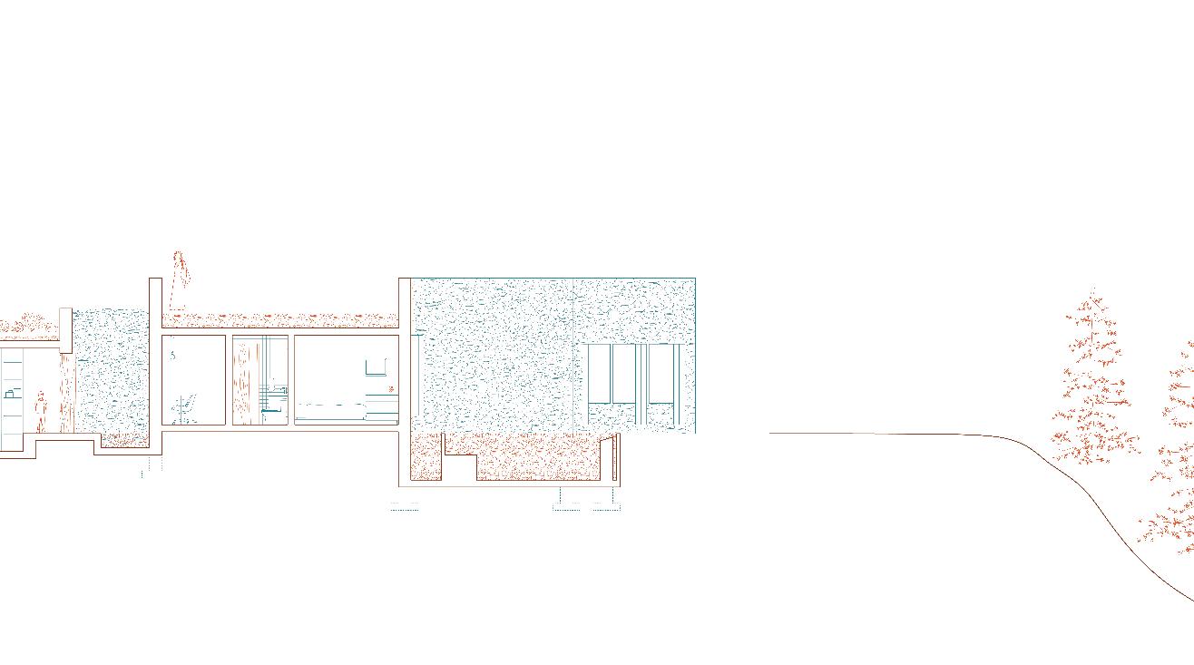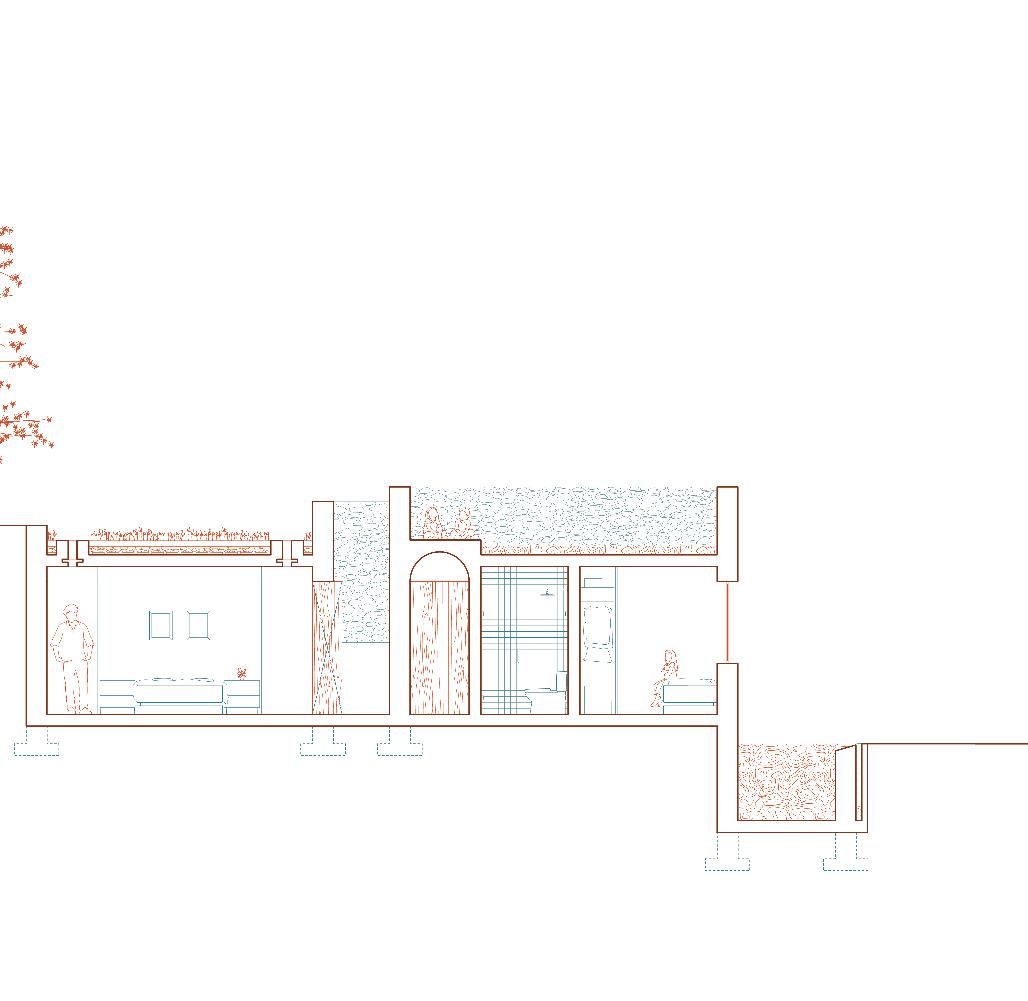This home is designed for a family with a blind family member. Using dark, ramped corridors, occupants must use senses besides sight to navigate and experience the home. The entrance to the house is inside an abandoned piece of infrastructure that was once used to transport stones from the neighboring quarry. The bottom face of the house peaks out of the hill, providing light and views for the seeing members of the family. The corridor system defines the project by forming rooms and creating transitional thresholds between the dark and the light. Dark spaces are more welcoming for someone who is blind and heightened senses besides sight are thus required in this home.