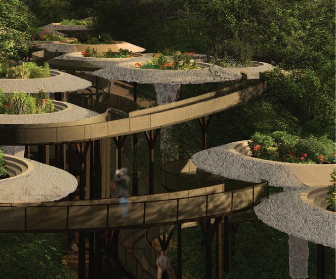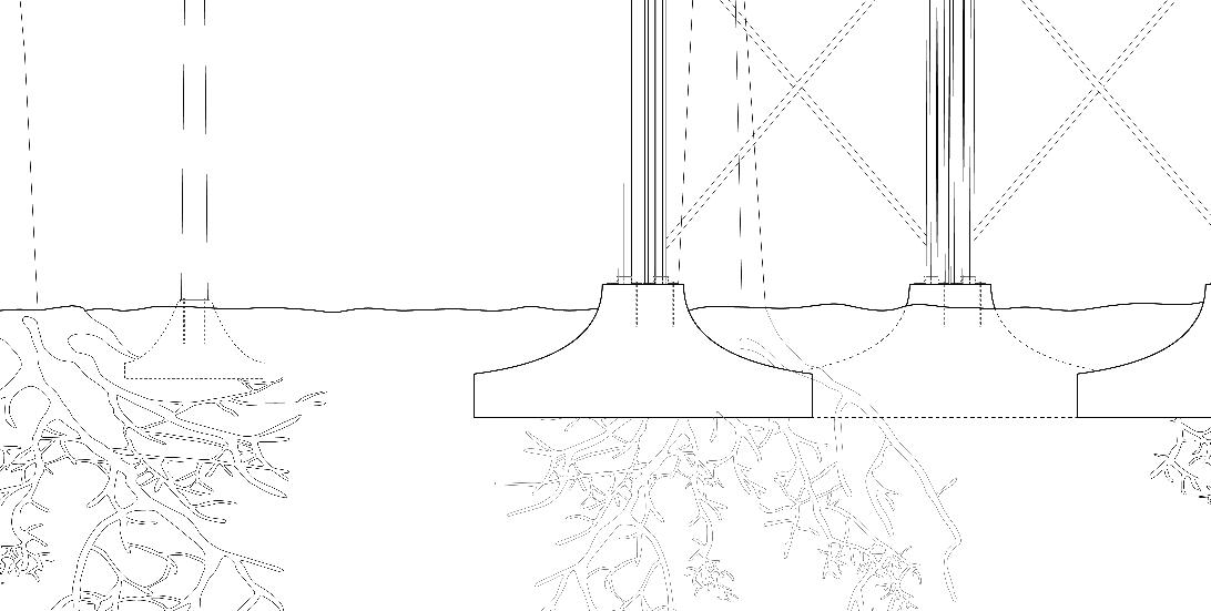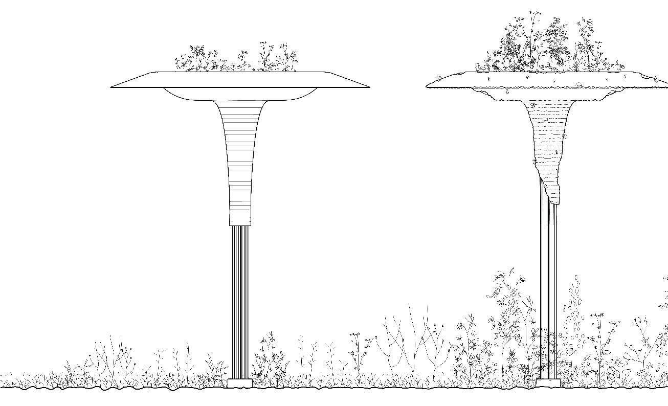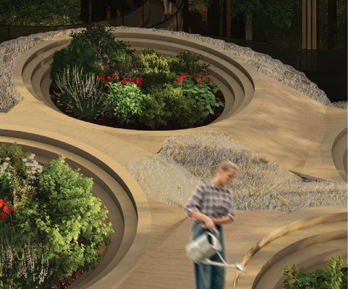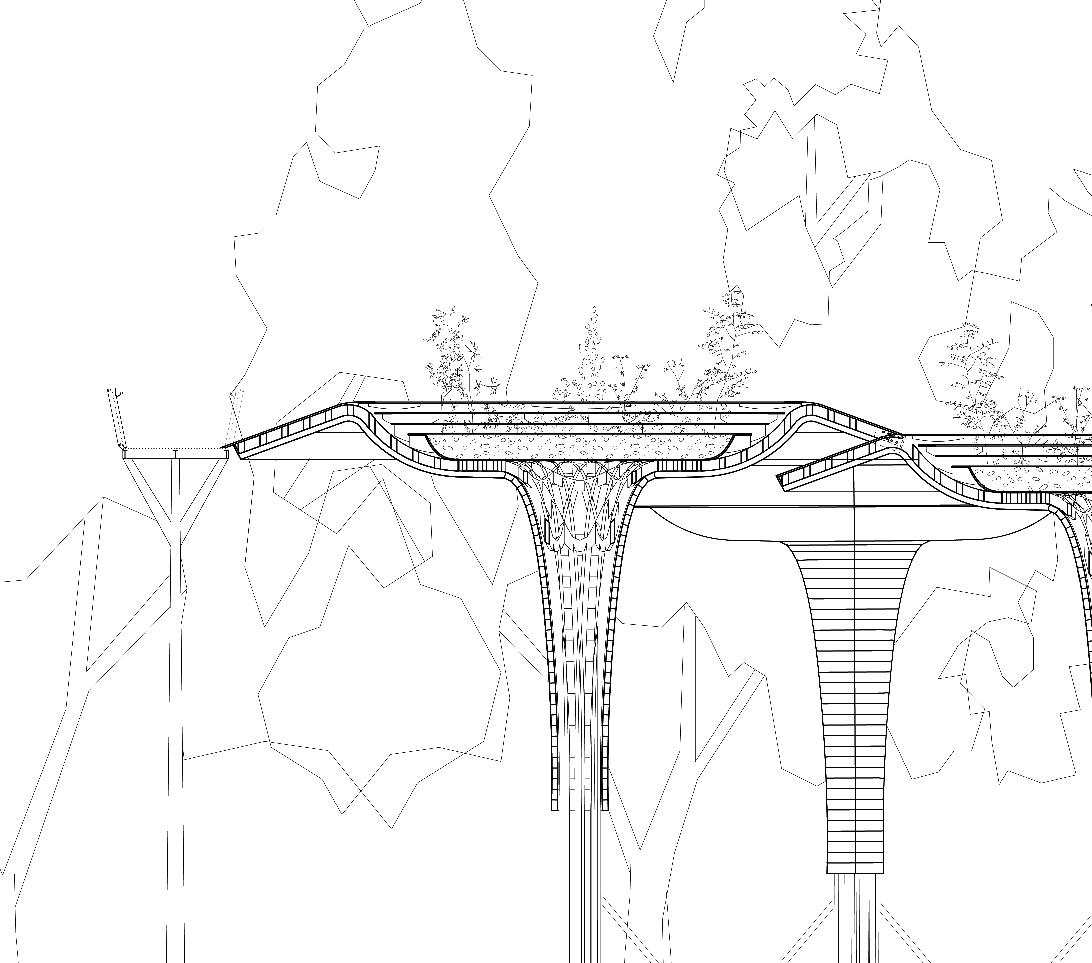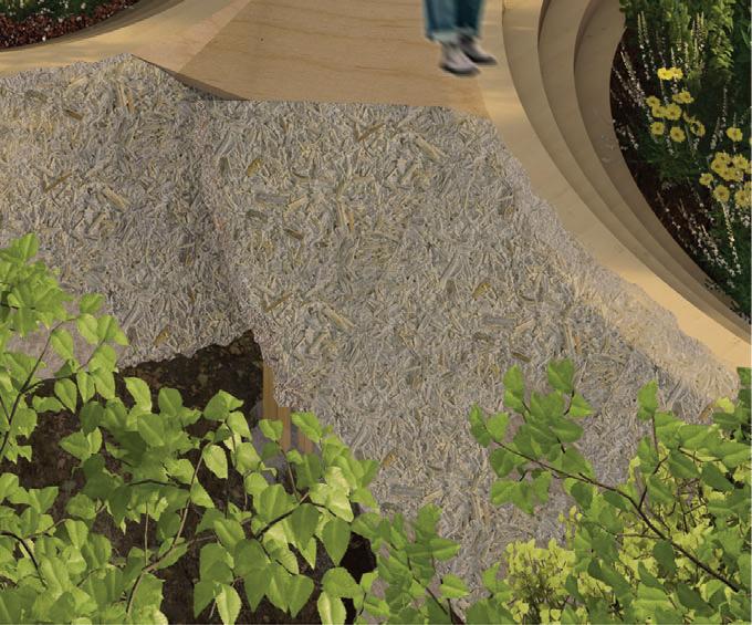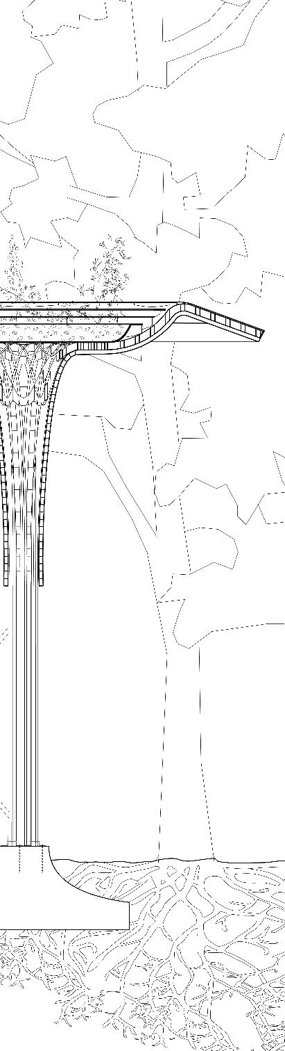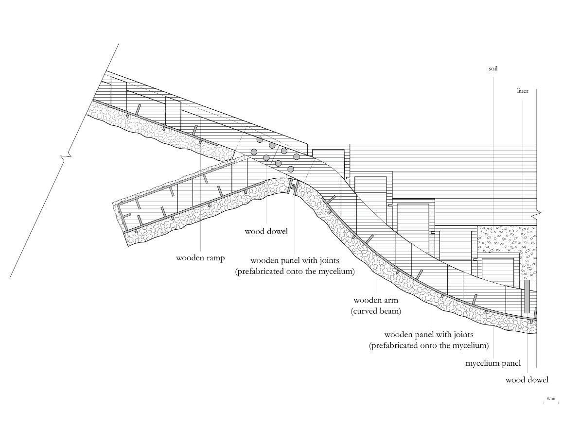 Raised allotment modules are composed of a timber waffle structure with a stepped timbe bowl holding soil and mycelium panels attached to the structure. The byproduct of their decomposition enriches the soil and encourages biodiversity as nature reclaims the space. The ground leel is one of decay and darkness while the uppermost level of allotments is bright and open.