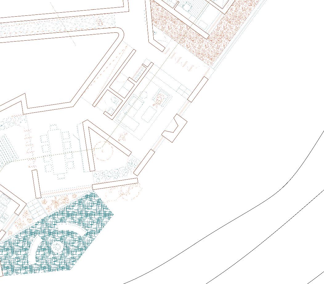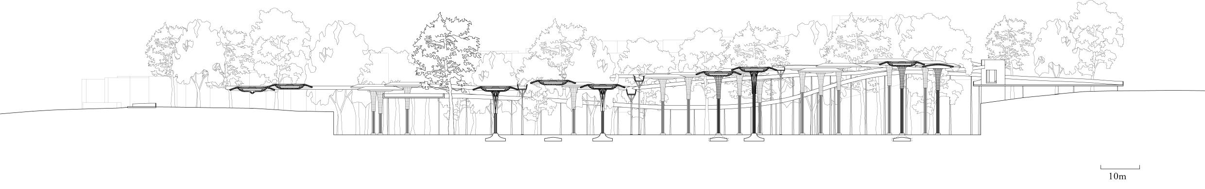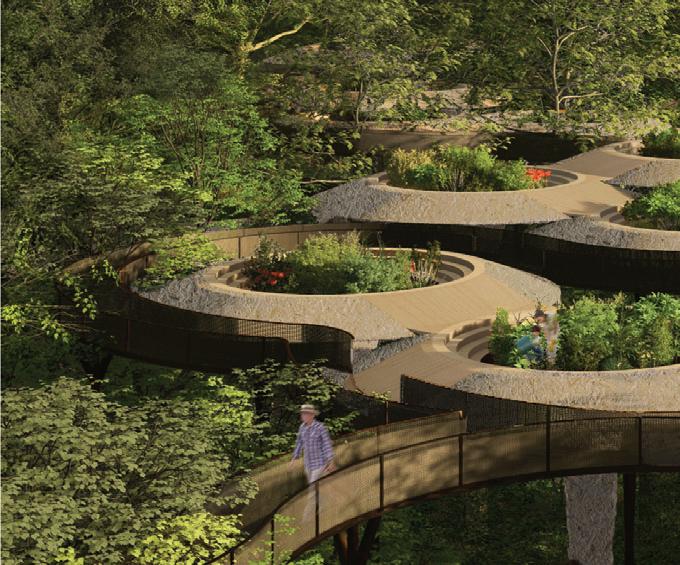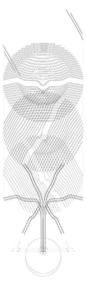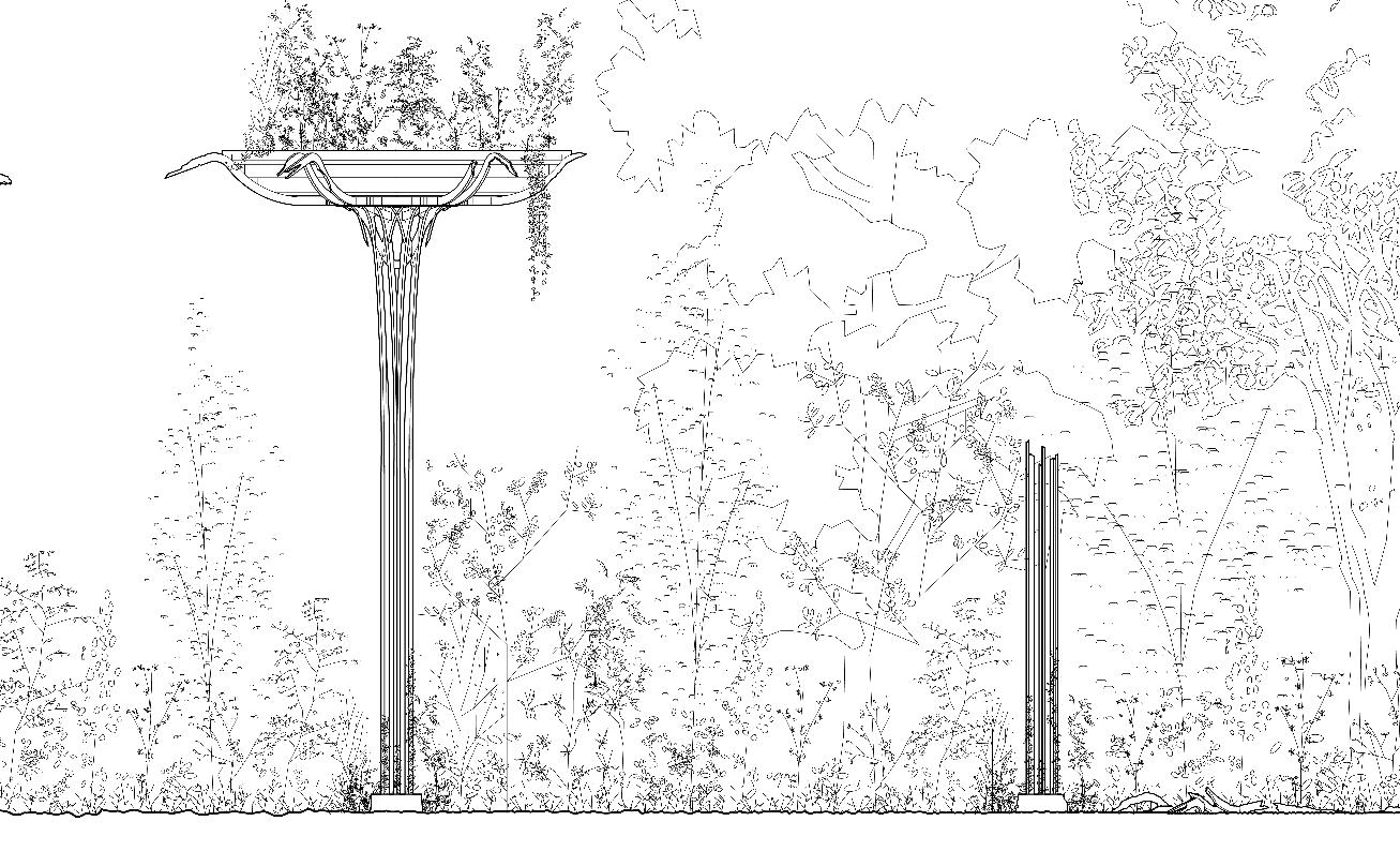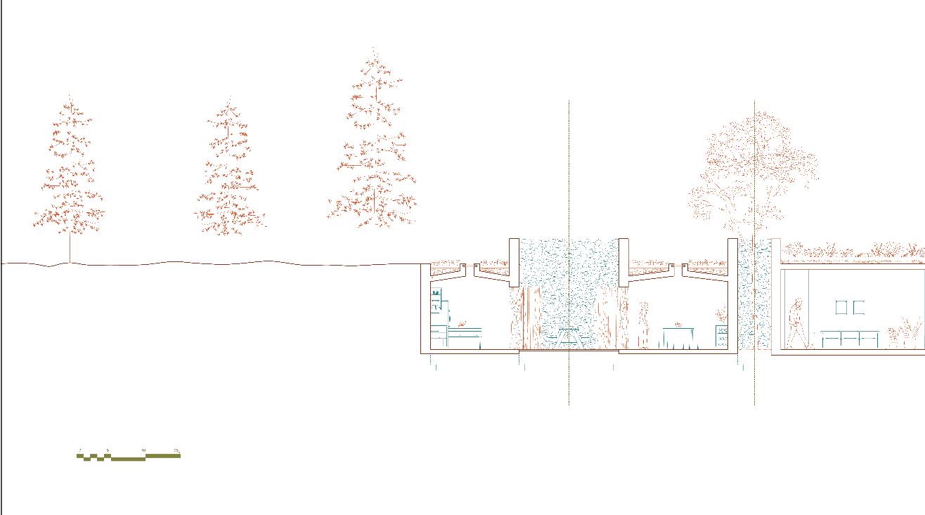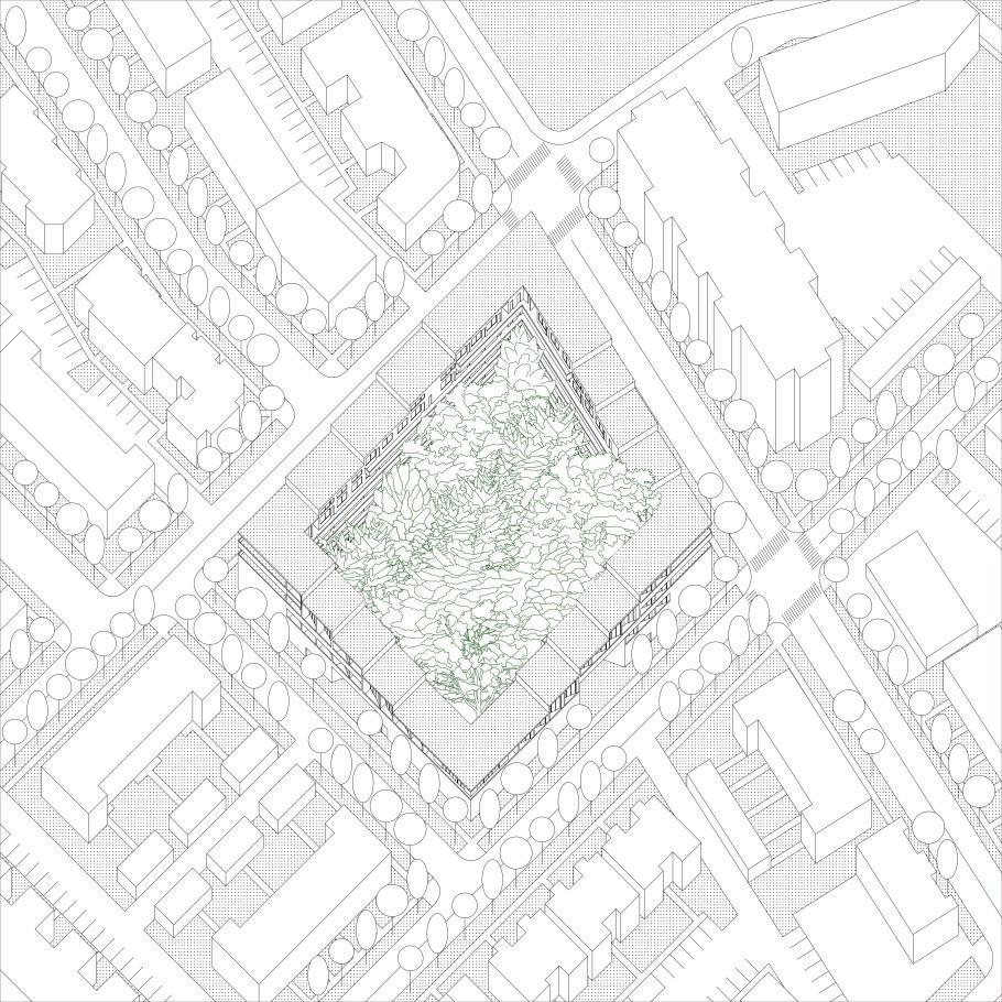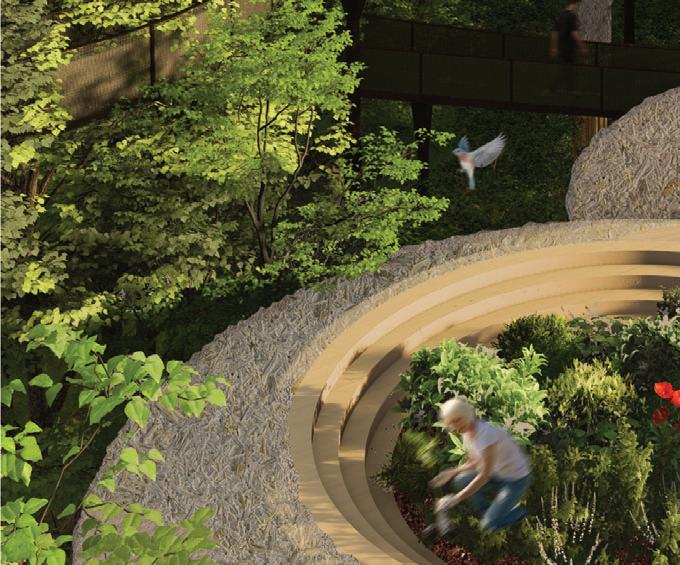Raised allotment modules are composed of a timber waffle structure with a stepped timbe bowl holding soil and mycelium panels attached to the structure. The byproduct of their decomposition enriches the soil and encourages biodiversity as nature reclaims the space. The ground leel is one of decay and darkness while the uppermost level of allotments is bright and open.
