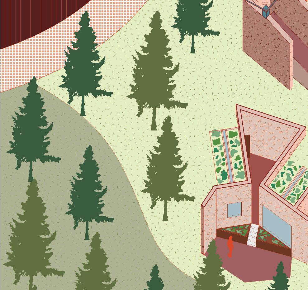 This project aims to provide allotments for families in the Highgate neighborhood, while being interested in te decay of building materials over time. Interventions are constructed primarily of biomaterials, allowing for both deliberate and speculative decay. Compostable biomaterials enable a circular return to the environment and contrast the ruins of the station below.