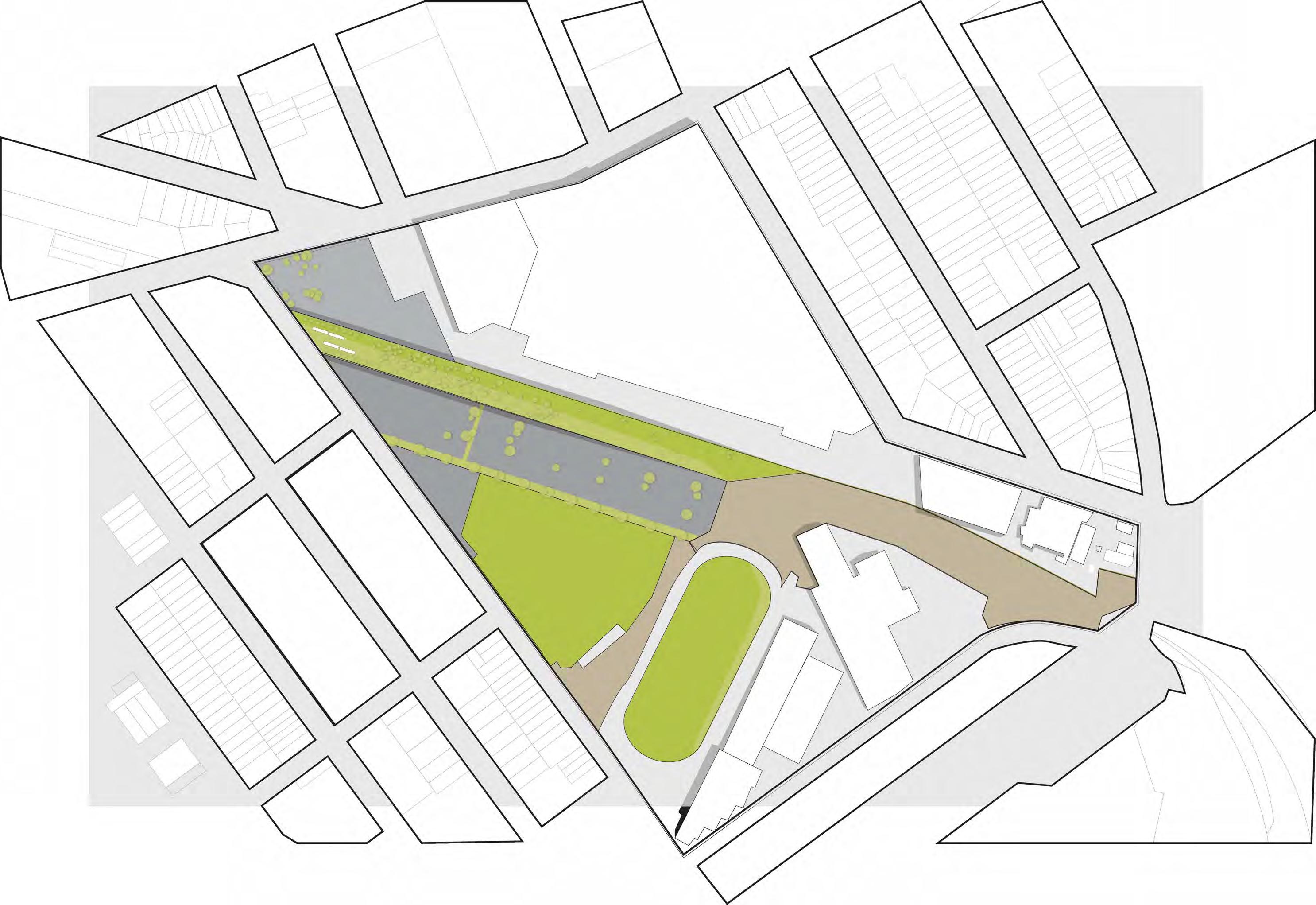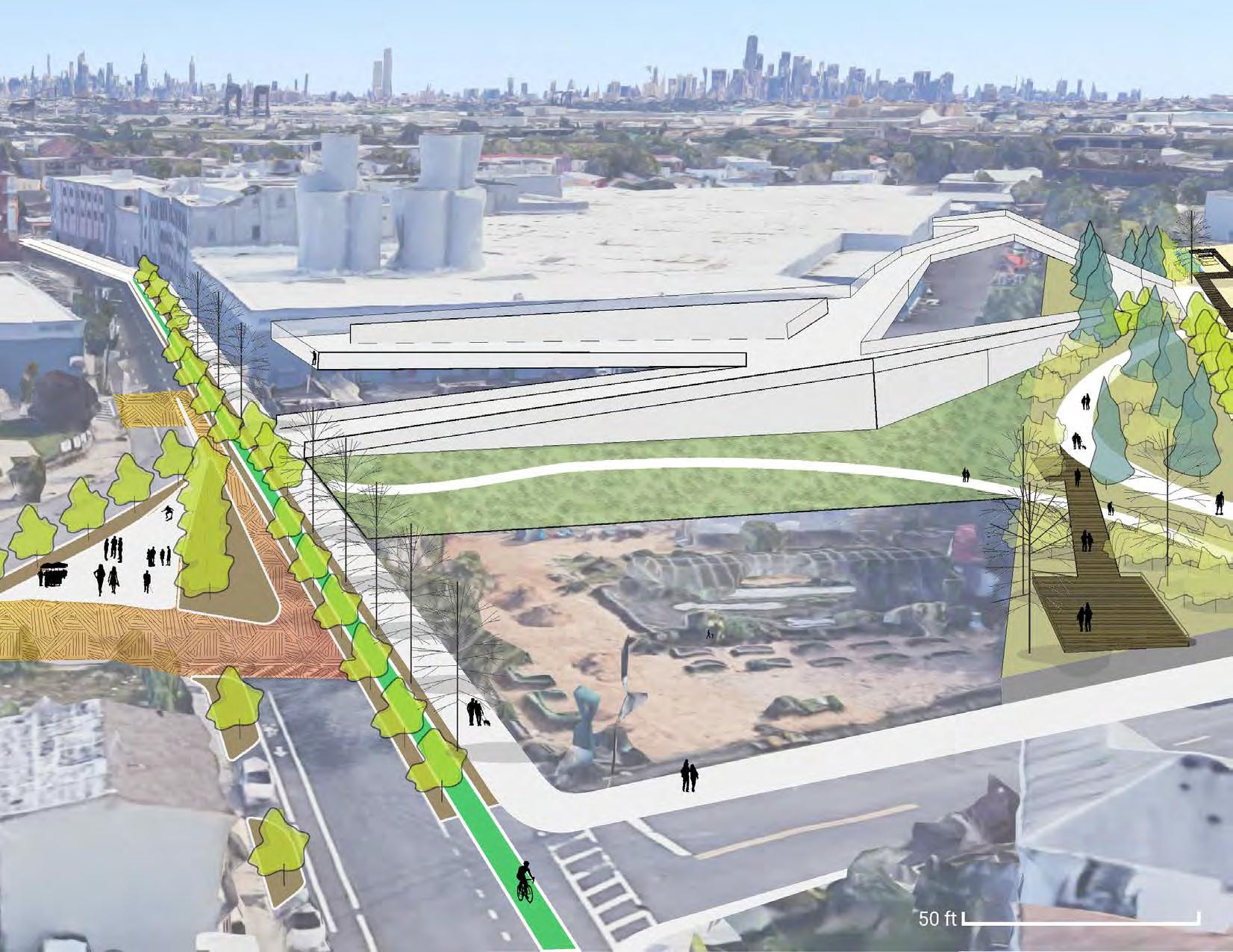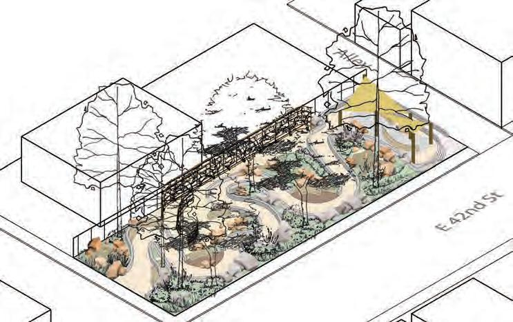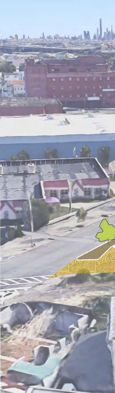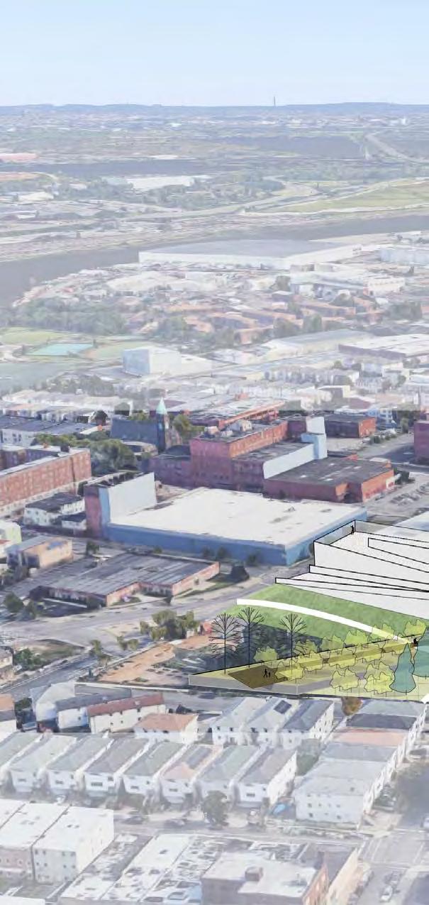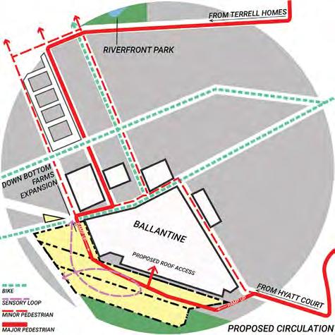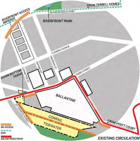 Greenways, expanded recreation, and a lighted pedestrian ramp connecting the Conrail site and Ballantine roof will allow users of different abilities to access all sites. This proposal offers an alternate plan for the Ballantine superblock and surrounding sites, where the community has the opportunity to make use of as much currently under-utilized space, addressing social, ecological, and economic community goals. ea S t iron B