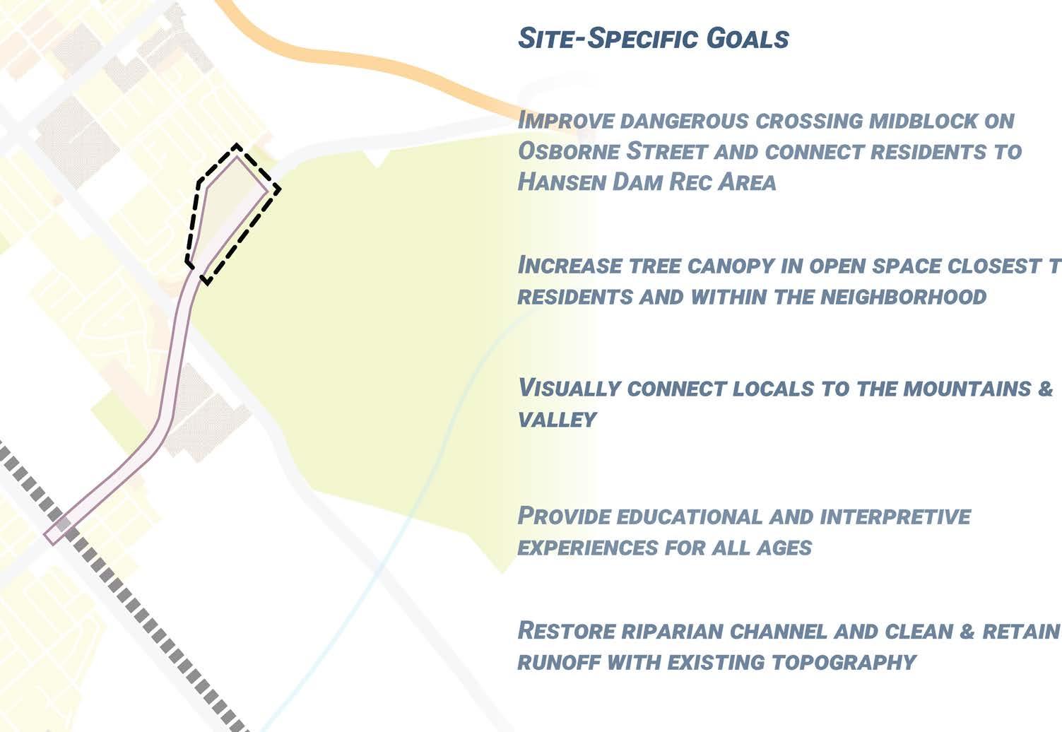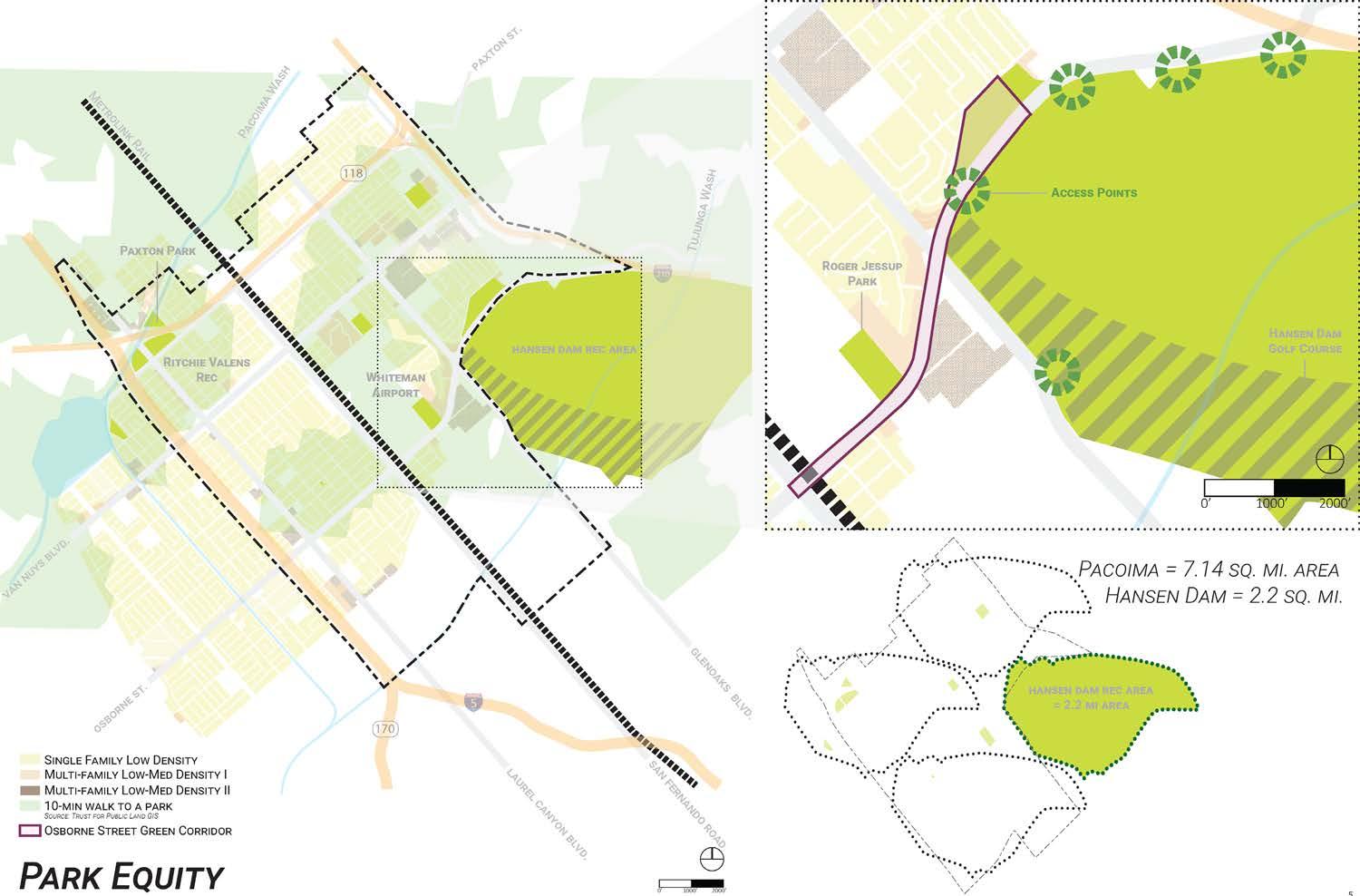 Open space is concentrated within Hansen Dam Rec Area. Osborne Street has the potential to become a green connection to neighborhoods facing the most park inequity.
