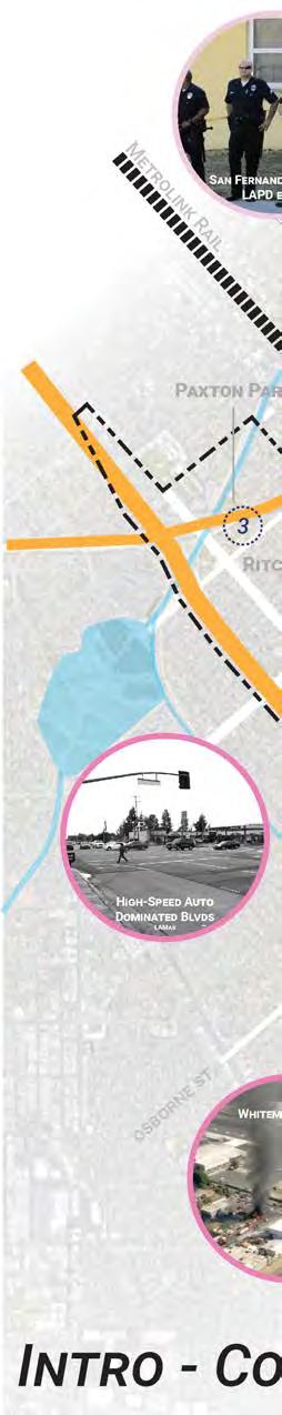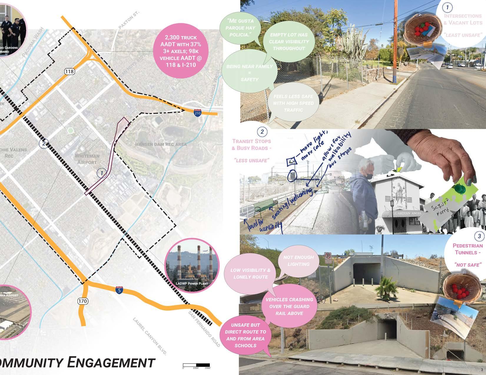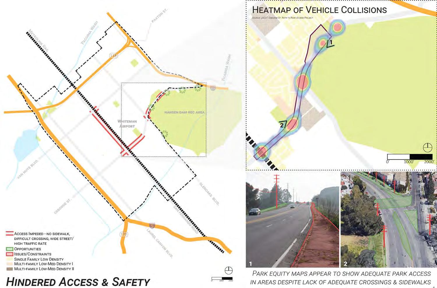 Many of Pacoima’s open space amenities are tied up in Hansen Dam, which, for most residents, is inaccessible by any means other than a vehicle. Locals who benefit from living nearby are burdened by less noise and air pollution from diesel particulate matter. The majority of Pacoima residents face numerous environmental justices due to a lack of buffer zones between residential and industrial, fragmentation by infrastructure, and leaded fuel from the local airport.
