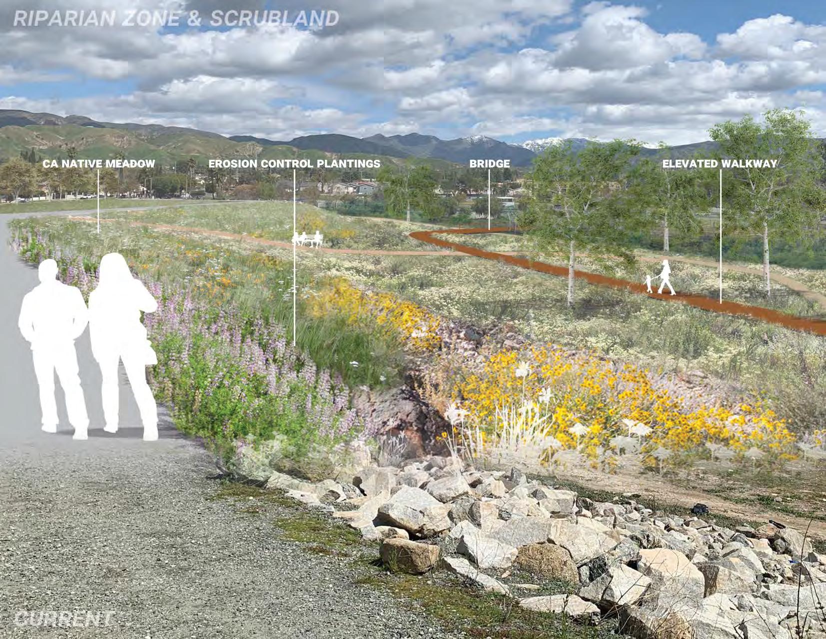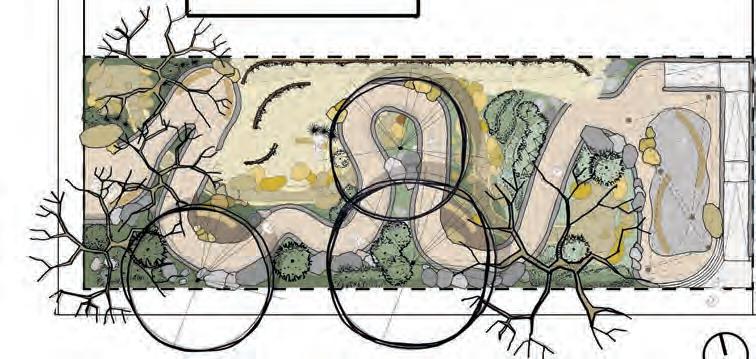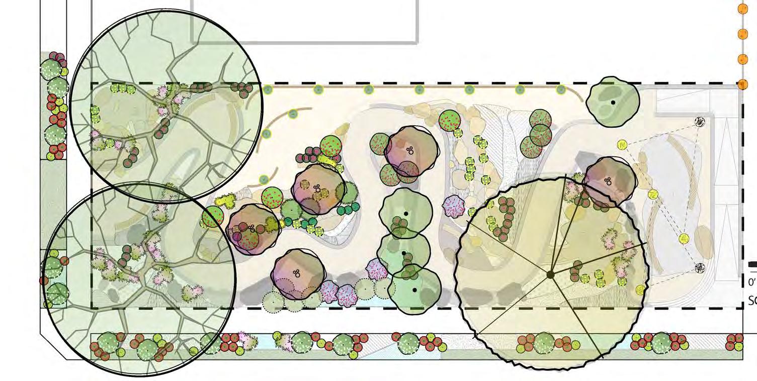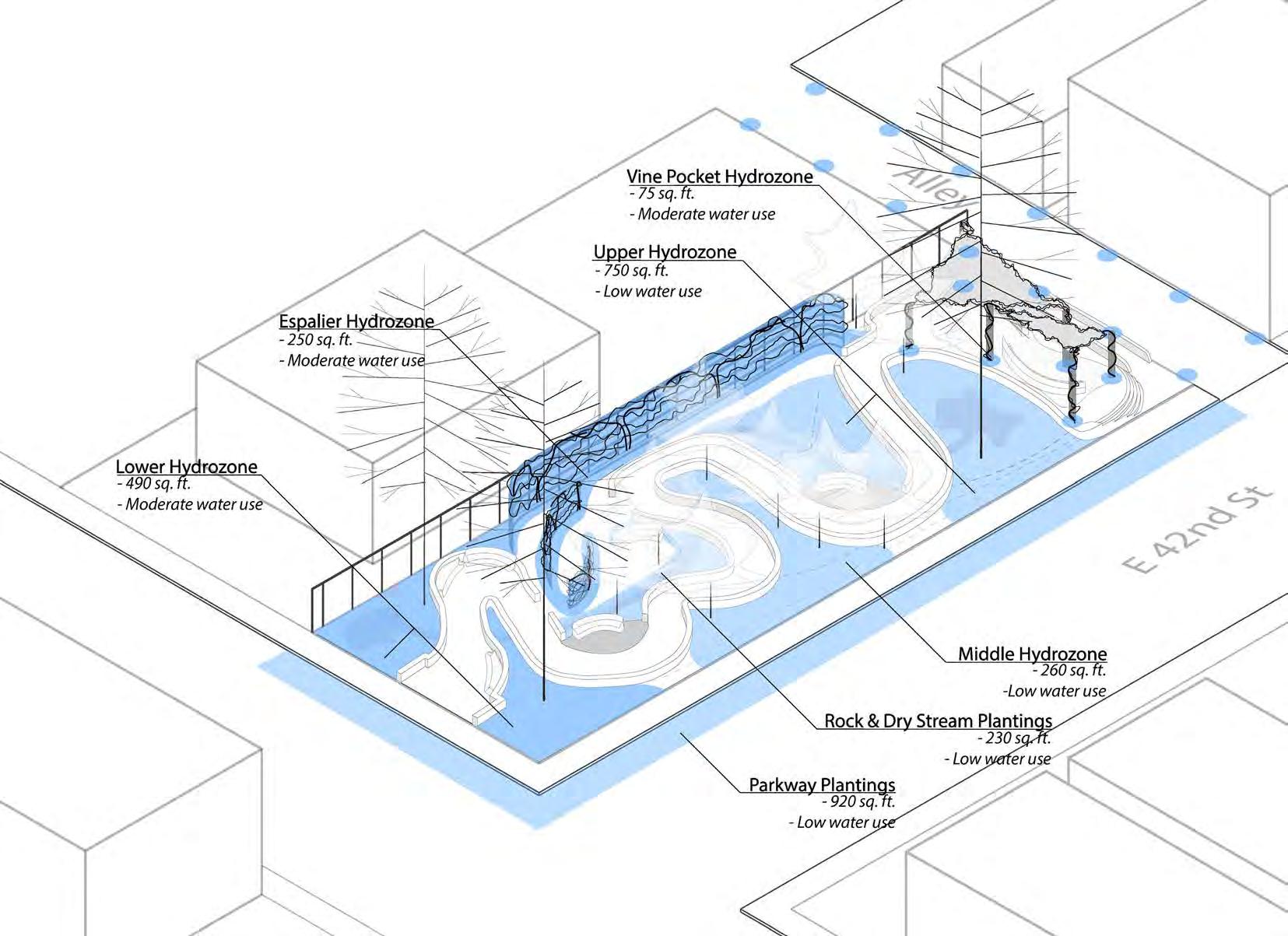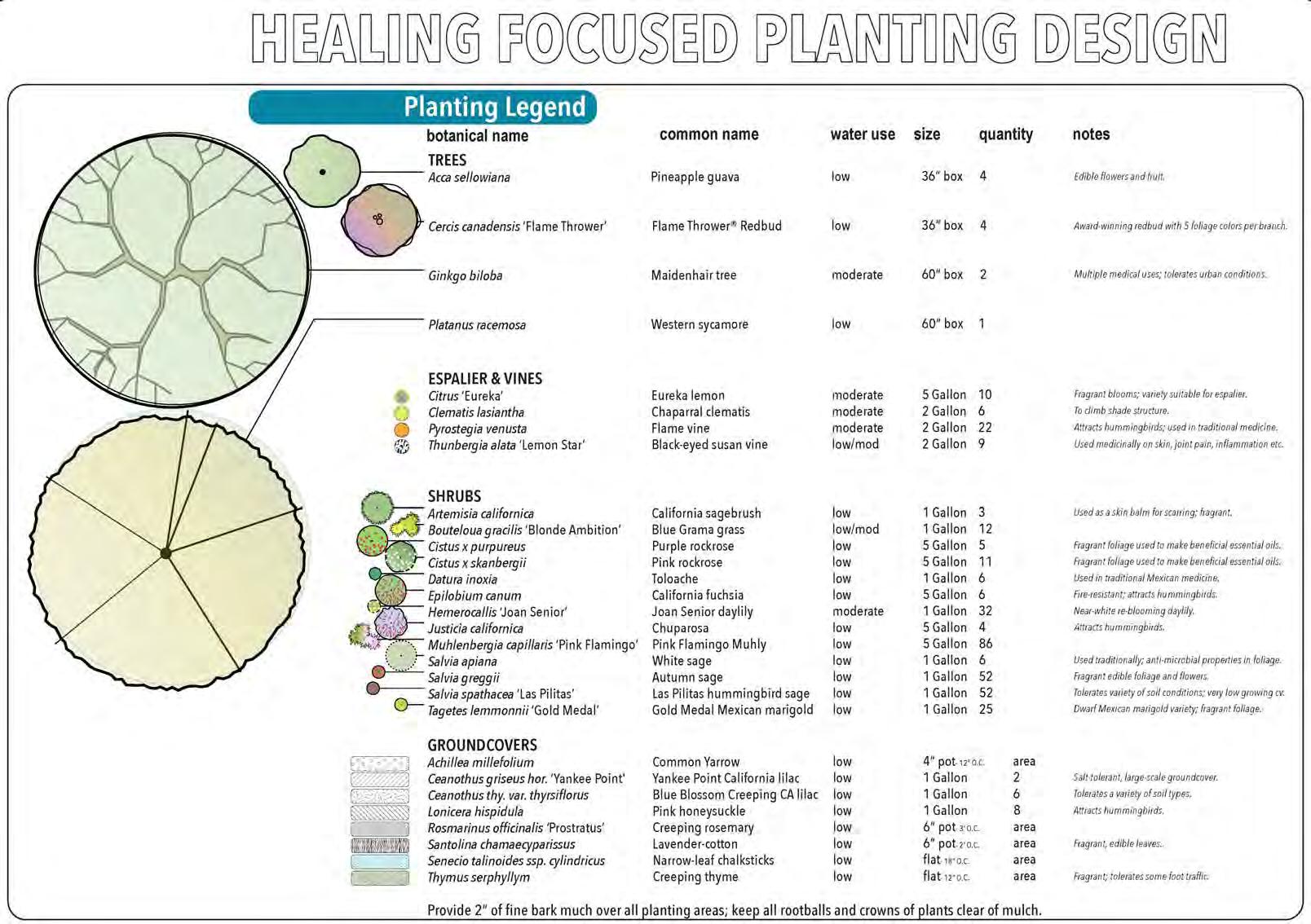 The South Central Healing Garden serves as a calming, restorative community space with plenty of shade and seating to escape the heat and stress of the city. Fruit trees espaliered along curving trellises, a dry stream to collect rainwater, large boulders and fragrant plants along the path stimulate the senses and quiet the mind.