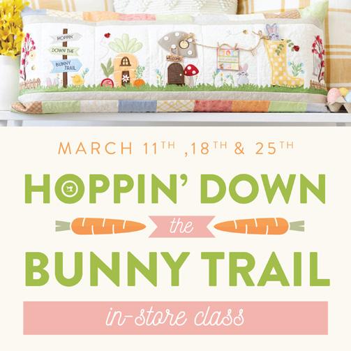 Join us in store for the Hoppin’ Down The Bunny Trail Bench Pillow Class! This will be a fun tips and tricks class on the new Kimberbell Hoppin Down the Bunny Trail bench pillow.