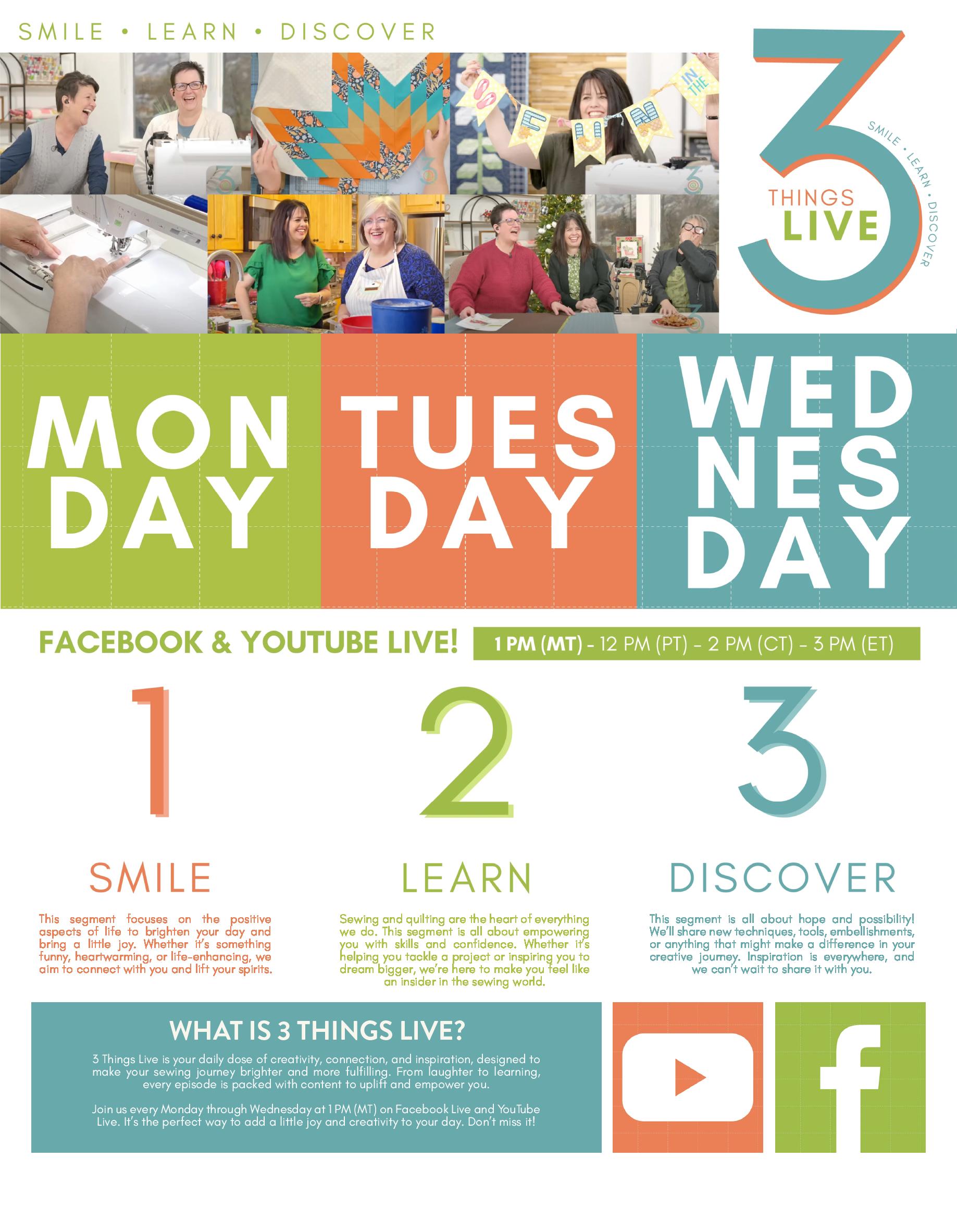 WATCH 3 THINGS LIVE To help you dive deeper into each month’s theme and get some inspiration, be sure to watch "3 Things Live" on Facebook or YouTube at 1 PM MT Monday-Wednesday during the first week of each month. In this live broadcast, we’ll share key insights, tips, or ideas to spark your creativity around that month’s Stitch Your Story theme. Whether it's a new technique, a fabric suggestion, or a prompt to help you reflect on the theme, "3 Things Live" will be your go-to resource for kick-starting your creative process.