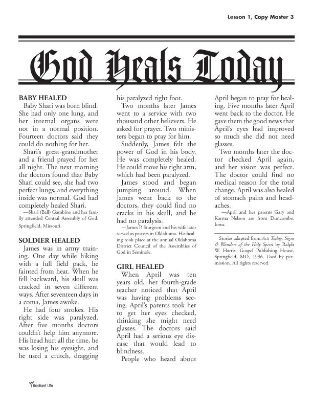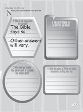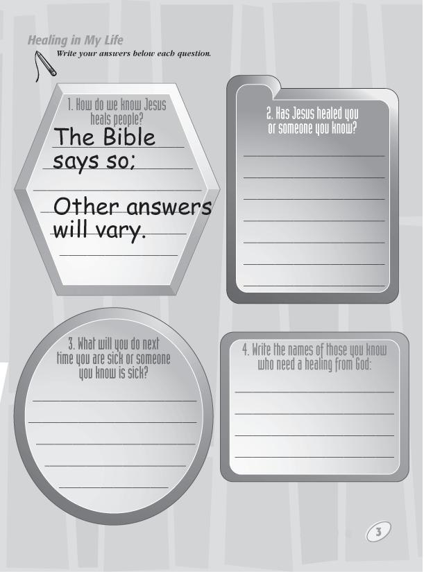 Read aloud, one at a time, the questions from “Healing in My Life” on page 3 of the student guide. Give students time to write in their responses. (Answers: 1. Answers will vary. The Bible tells of Jesus’ healing people; the Bible promises healing; God heals people today.