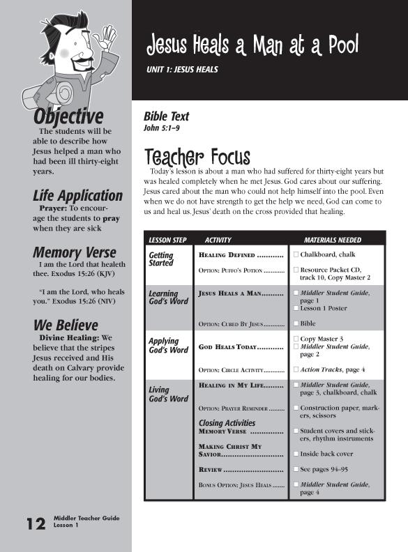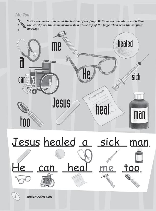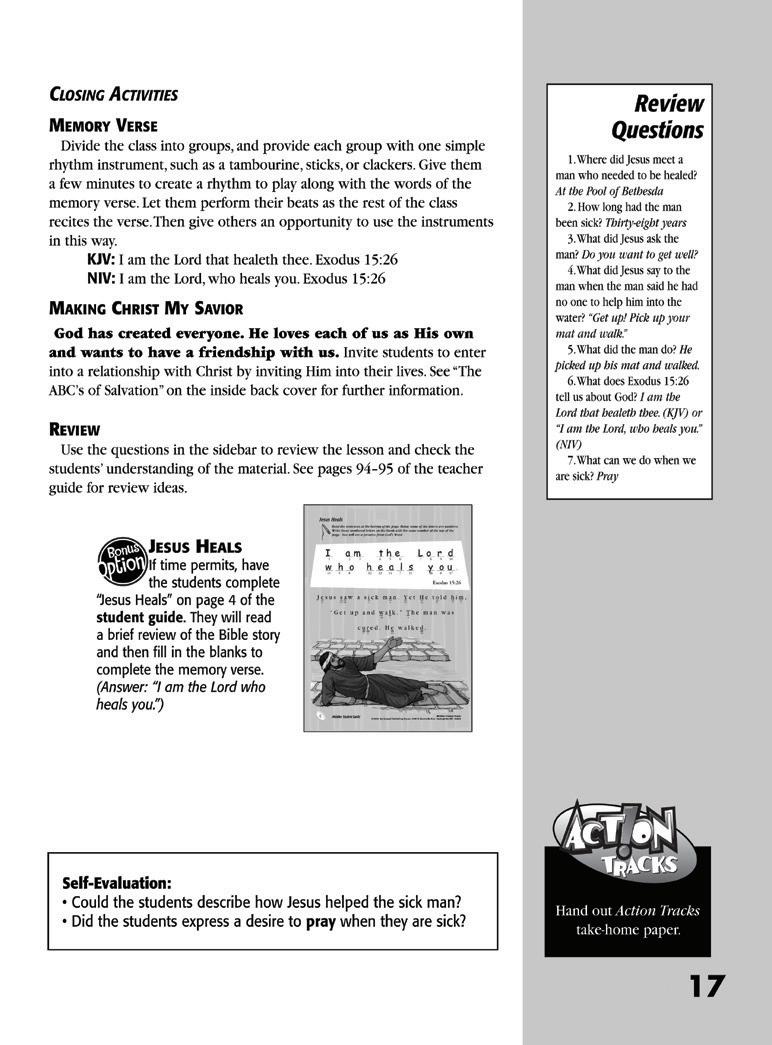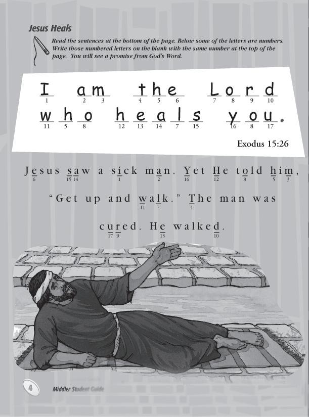 If time permits, have the students complete “Jesus Heals” on page 4 of the student guide. They will read a brief review of the Bible story and then fill in the blanks to complete the memory verse. (Answer: “I am the Lord who heals you.”)