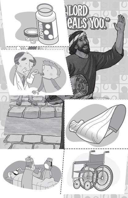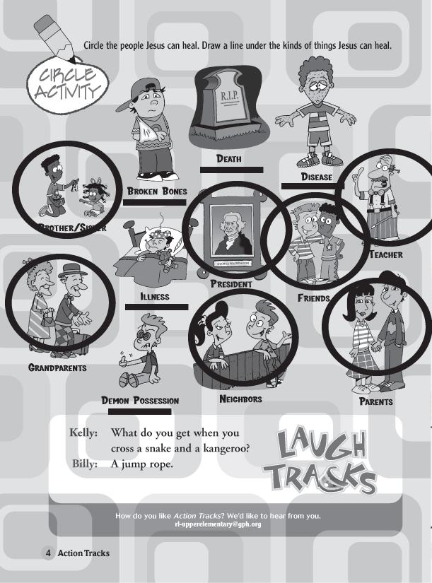 An alternative way to help the students apply the Bible story is for them to complete “Circle Activity” on page 4 of Action Tracks. They will identify people Jesus can heal and the kinds of things Jesus can heal. (Answers: Circle all the people. Underline all the situations.)