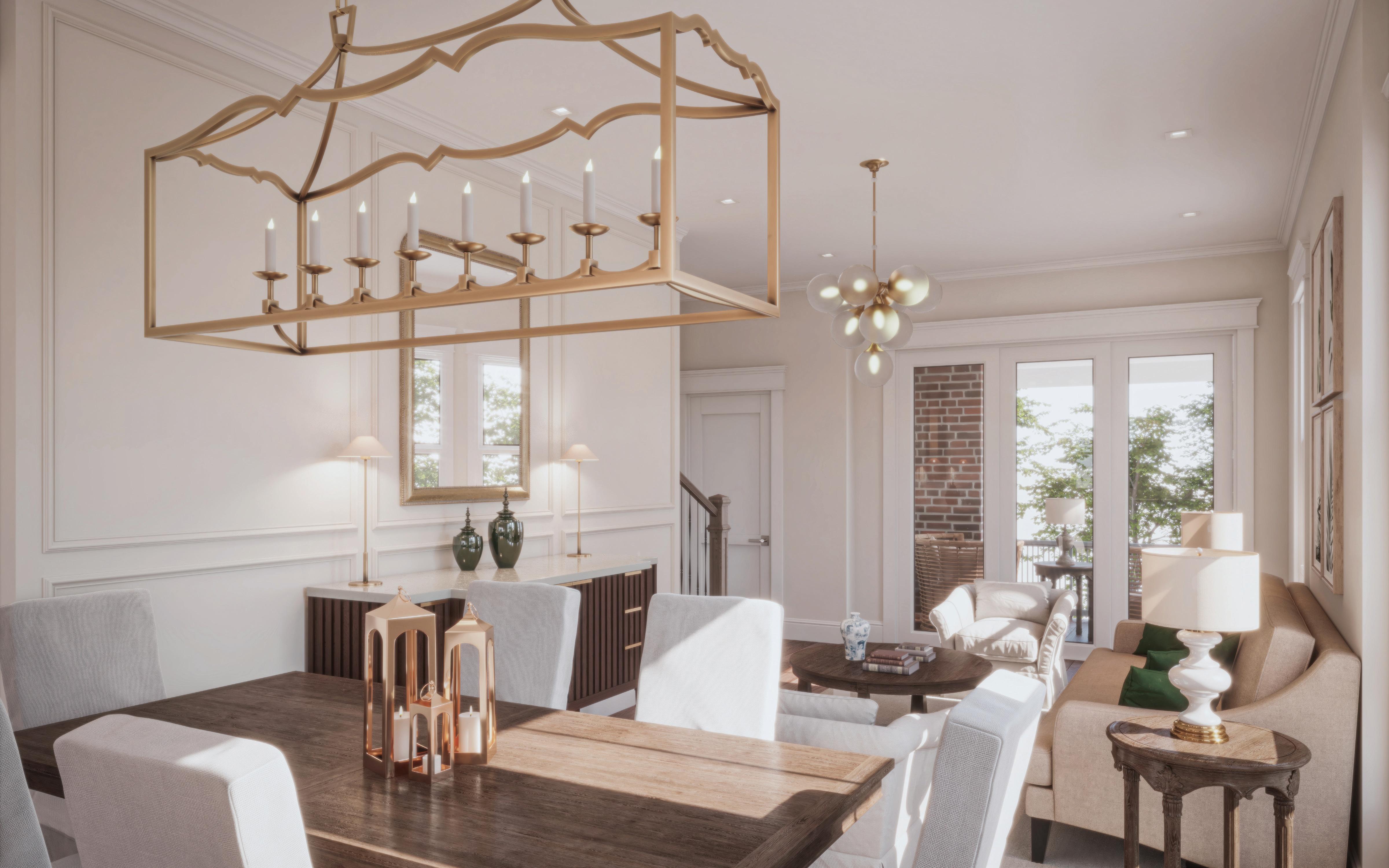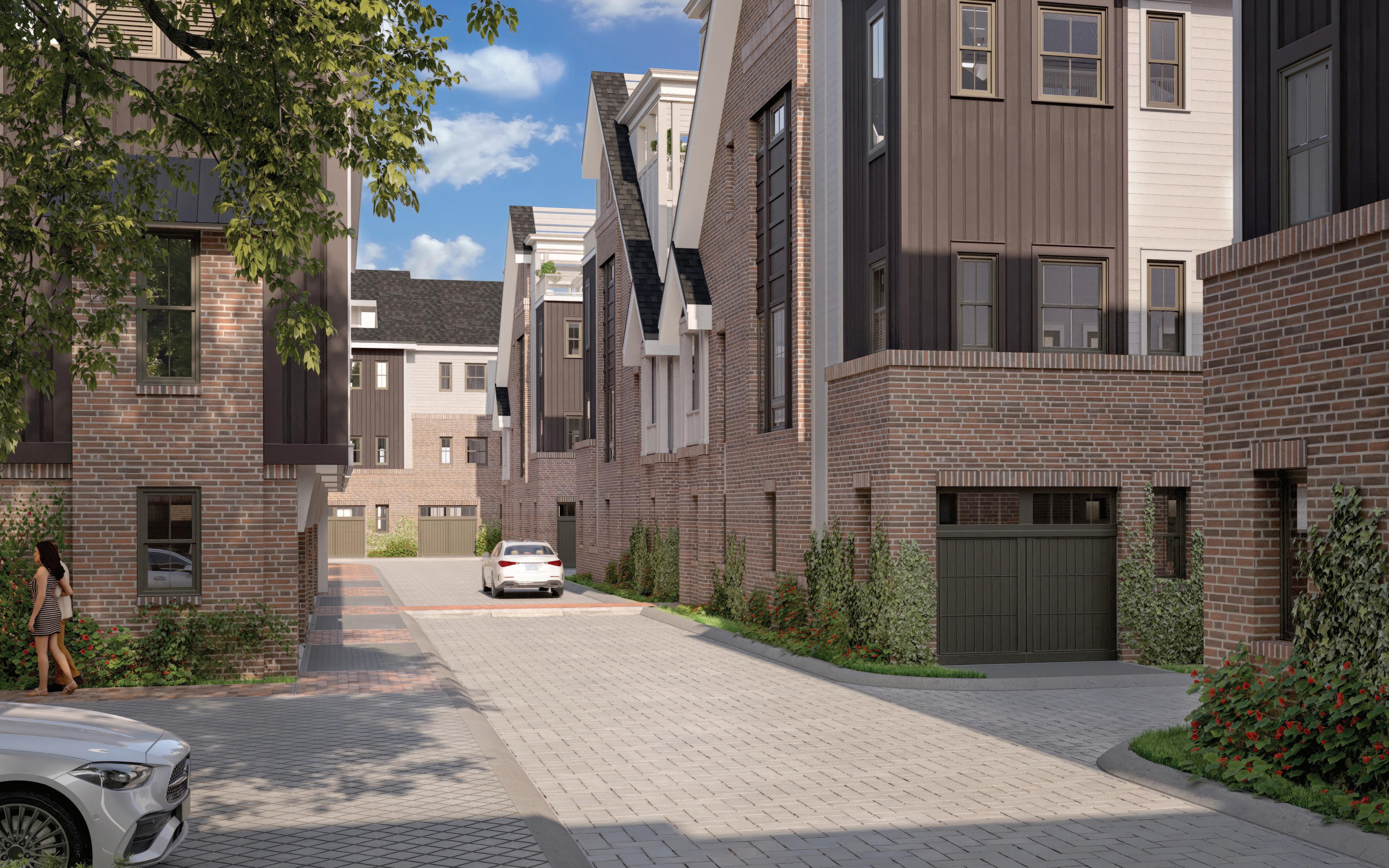 Inspired by the surrounding neighborhood, Selwyn Walk’s architecture mingles brick and elevated lighting along charming facades and individually laid paver streets. Select homes enjoy skyline views from rooftop terraces and every townhome has its own private, 2-car garage. To honor the history of this site, Goode Properties and Cluck Design Collaborative lovingly saved craftsman-style stained glass windows to incorporate into the development.