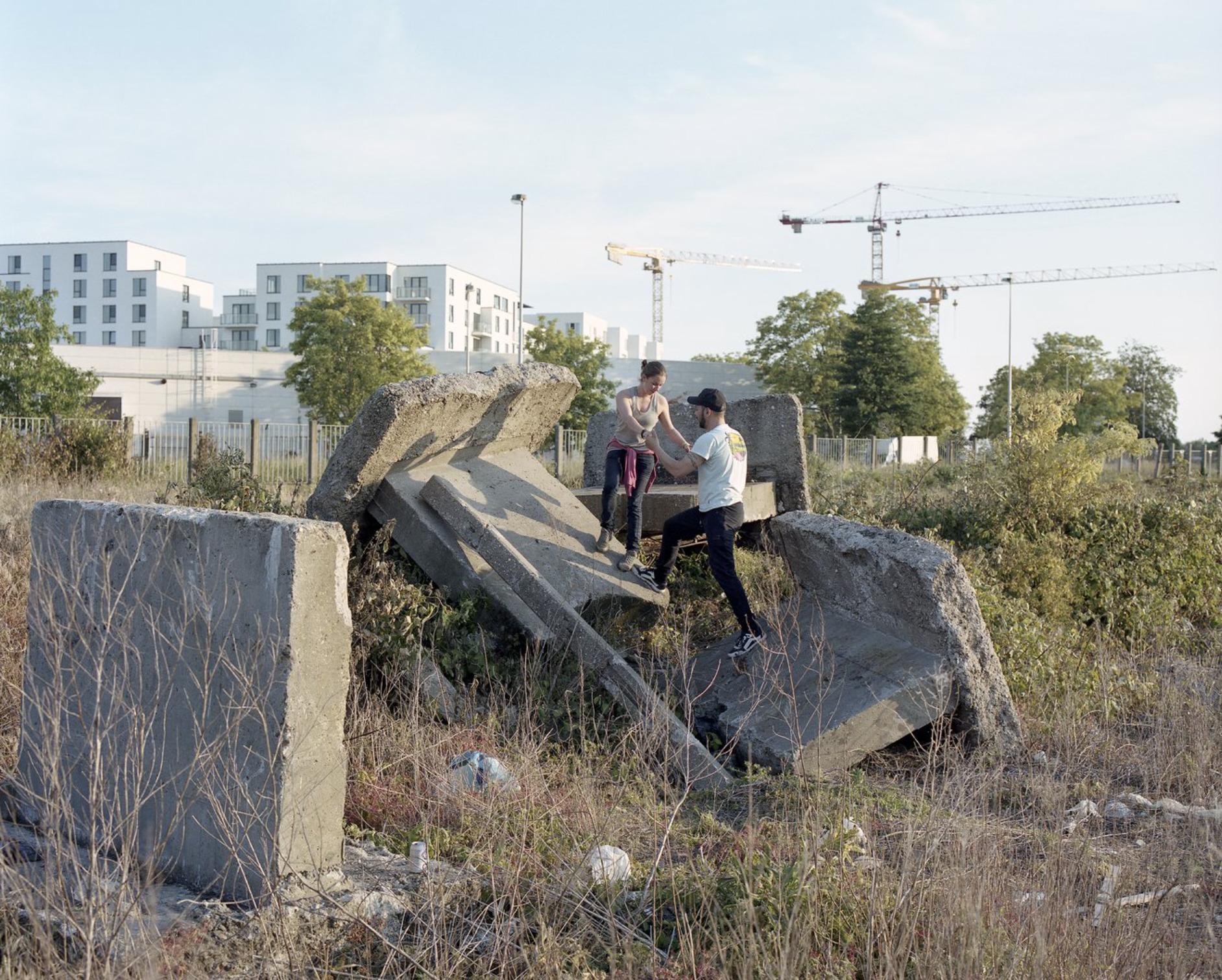 Lyon, T., Vanden Neste, P., Ancien camp de rom évacué en 2018. Valérie et Abdel, deux amoureux d’une vingtaine d’années, se baladent sur le terrain vague. A l’arrière-plan, les immeubles de Citydox et Manu, jeune portugais et mécanicien dans le garage familial situé à proximité
