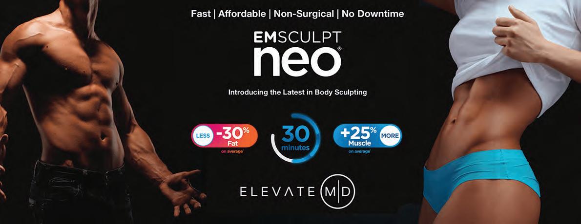 Dr. Blumenauer is the only surgeon in Martin County that o ers both the Emsculpt Neo and Emface platforms. ese are non-invasive devices that utilize radiofrequency and high-intensity, focused electromagnetism to treat targeted areas of the face, abdomen, anks, buttocks, arms and thighs. e Emface tones both the skin and facial musculature resulting in less wrinkles and more of a natural li without the need for injectables. Patients report up to a 30% increase in facial muscle tone, 37% reduction in wrinkles and 23% increase in li . e Emsculpt Neo builds muscle and eliminates fat to improve tone and contour of the body and extremities. Patients can see an average of 30% reduction in subcutaneous fat and 25% growth in muscle volume with the Emsculpt Neo. ese revolutionary technologies have no down time and treatment sessions are only 20–30 minutes.