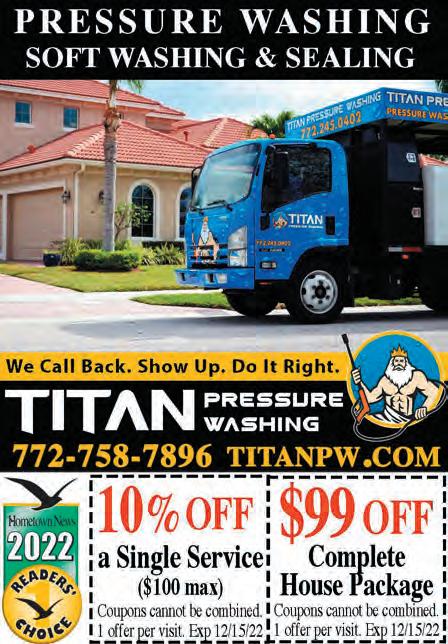 62 VOL. 561 A Copyrighted© My Living Media. 2023 All Rights reserved. To Advertise call 772-247-6849 Need More Coupons - MyLivingMedia.com Veteran Owned 13+ years Experience Fully Insured PRESSURE WASHING ROOF CLEAN & SEAL! $50 OFF Coupons cannot be combined. 1 o er per visit. Exp 3/15/23 Roof Cleaning $250 OFF Coupons cannot be combined. 1 o er per visit. Exp 3/15/23 Roof Seal UP TO Scan here to schedule your FREE estimate 772.773.6629 WWW.MYTCTRIMLIGHT.COM Pre-Set Patterns for: Homes • Businesses • Pool Enclosures • Special Events & Holidays • 16 Million Colors • On/Off Schedule • Dimmable Lights • Lifetime Product Warranty PERMANENT LED COLOR-CHANGING LIGHTS RAINBOW LIGHTS SELECTED ON APP WHITE LIGHTS SELECTED ON APP MOBILE APP ACCESSIBLE Purchase over 150LF Expires 3/17/23 $375OFF BEAUTIFY YOUR YARD! FREE ESTIMATE QUALITY GUARANTEED 772.626.3704 CALL US TODAY! About Us: • Locally Owned & Operated • Licensed & Insured • Over 10 Years Serving the Treasure Coast • Create Relaxation Space • Landscape & Hardscape Design • Tree Removal/Trimming • Stump Grinding • Bob Cat • Lot/Land Clearing • Site Work & More We Honor Those Who Serve Evolution Forestry & Landscaping evolutionforestry.com New or Revitalized Landscaping Project $1,000 or more. (*Max Discount of $100). With this AD. Expires 3/17/23 $100OFF