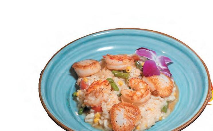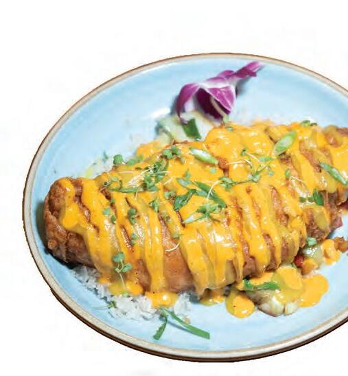 Another excellent option is one of the most popular items on the menu: Hudson’s Snapper ($38). e generous plate includes a huge piece of fresh, tempura snapper with coconut jasmine rice, baby bok choy, bell peppers, mango jalapeno coulis, and spicy coconut aioli. e mild sh rst pops with bites of spice, then is balanced by the avor of the subtly- oral rice. Paul really