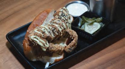 Seafood lovers, on the other hand, should take the leap and select what is arguably the most unique item on Hudson’s menu: the octopus “hotdog” ($19). Cornmeal-dusted con t octopus is layered with napa cabbage, black garlic aioli, avocado wasabi aioli, and