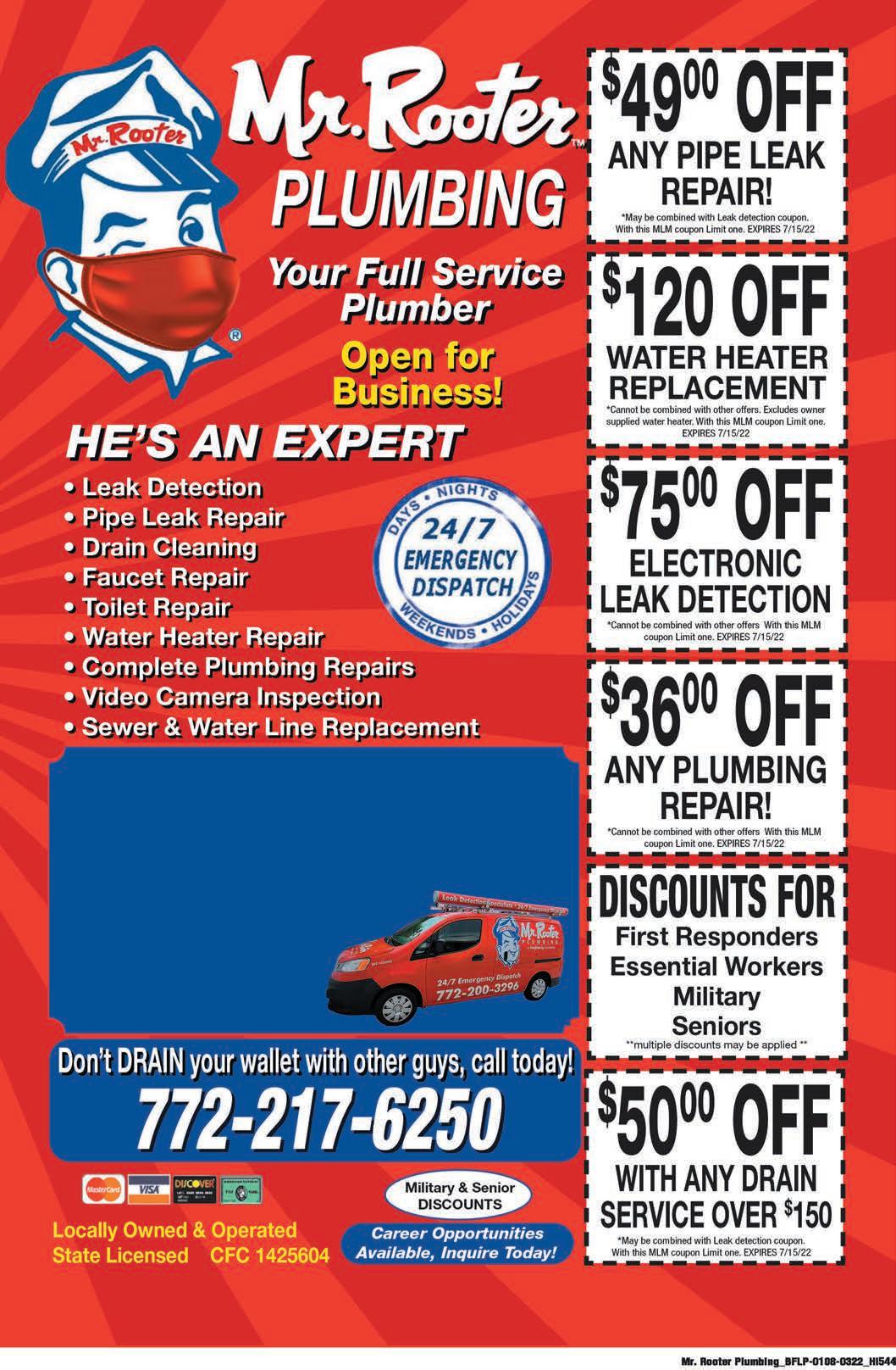 VOL. 556 B 33 Copyrighted© My Living Media. 2022 All Rights reserved. To Advertise call 772-247-6849 BenFranklinPlumber.com Lic.#CFC1430437 Ins. EOE/DFWP ★ ★ ★ ★ ★ ★ ★ ★ ★ ★ ★ ★ ★ ★ ★ ★ ★ ★ ★ ★ ★ 772-380-4451 Call Today 24/7 EMERGENCY SERVICE • Clogged Drains • Water Heaters • Toilet Repairs • Garbage Disposals • Leak Detection • Whole House Re-Pipe $47 Service call Will call with 45 minute notice when on the way. Client must be available between 8am-6pm the day the appointment is booked. Coupon can be used M-F excludes holidays. Cannot be combined with any other offer. EXPIRES 1/06/23 EXPIRES 1/06/23 EXPIRES 1/06/23 EXPIRES 1/06/23 EXPIRES 1/06/23 EXPIRES 1/06/23 HARD WATER SPEEDS UP AGING OF YOUR HOME’S PIPES. IT ALSO CLOGS PIPES AND WON’T MAKE YOU LOOK ANY YOUNGER. WE CAN HELP! PLUMBING $75 off Any New Toilet Provided & Installed by BFP Cannot be combined with any other offers. Cannot be combined with any other offers. Cannot be combined with any other offers. Cannot be combined with any other offers. Cannot be combined with any other offers. Any Standard, Deluxe, or Premium Water Heater $100 off Any Whole House City Water Filtration System $300 off Any Whole House Tankless Water Heater $150 off$50 off ANY PLUMBING REPAIR Over $225 If there’s any delay, it’s you we pay!®