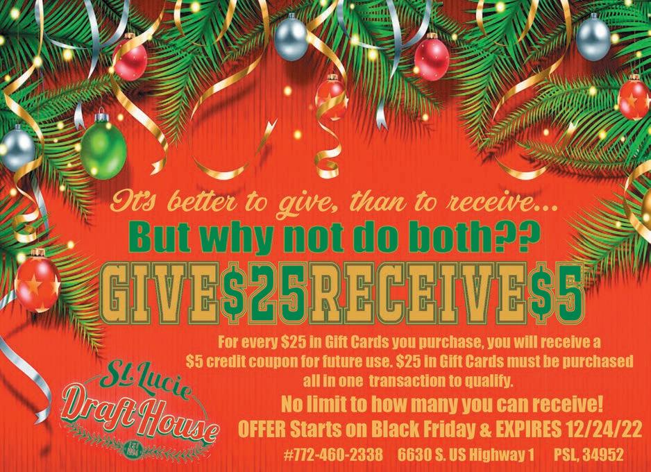 VOL. 556 B 23 Copyrighted© My Living Media. 2022 All Rights reserved. To Advertise call 772-247-6849 Need More Coupons - MyLivingMedia.com TWO 16” LARGE CHEESE PIZZAS 12 Garlic Knots, 12 Mozzarella Sticks, 1 - 2-Liter Soda Must Present Coupon. Cannot be combined with any other offers. Expires 01/15/23 Must Present Coupon. Cannot be combined with any other offers. Expires 01/15/23 FAMILY SUPER DEAL $3999 475 Rio Mar Drive (Off US 1) Port St. Lucie GO TO GetBellaRoma.com to Order Online 772-732-ROMA (7662) PIZZERIA • BAKERY • RESTAURANT HOURS: MON - THUR 9 AM - 9 PM FRI - SAT 9 AM - 9 PM SUNDAY 9 AM - 8 PM PIZZERIA OPEN AT 11 AM DAILY for the Let Us Cater Your Holiday & Parties 1 LARGE 16” CHEESE PIZZA & 6 Garlic Knots $1499 Grab your Amigos and join us for... 772-232-6131 1840 NE Jensen Beach Blvd. (In the Publix Shopping Plaza) $5off Any purchase of $30 or more. With this MLM coupon. Not valid on Tuesdays, Holidays, special occasions, or with any other offers or specials. Expires 1/06/23 LUNCH SPECIAL With this MLM coupon. Not valid on Tuesdays, Holidays, special occasions, or with any other offers or specials. Expires 1/06/23 $4off with Purchase of any 2 lunches with 2 drinks. Taco Tuesdays Guacamole Wednesday Enchilada Thursday Top Shelf $5 $10 $7 $6 $10 Skinny Margaritas Margarita Mondays & Trivia from 7pm-9pm Taco Specials ALL DAY! Fresh Guacamole prepared tableside Chimichanga Served with Rice & Beans 2 Enchiladas Served with Rice & Beans USED TIRES $ 50 SYNTHETIC BLEND OIL CHANGE BRAKES A/C TUNE-UP ALIGNMENTS $3999 Most Standard Cars. With this MLM coupon. Expires 1/06/23 With this MLM coupon. Expires 1/06/23 $5999 PER AXEL from With this MLM coupon. Expires 1/06/23 $5999 from With this MLM coupon. Expires 1/06/23 $5999 772-222-5113 THE RIGHT TIRES FOR YOUR VEHICLE AND BUDGET • NEW AND USED TIRES • BALANCE • PATCH • PLUG • OIL CHANGE • BRAKE REPAIR • A/C REPAIR • ALIGNMENTS 2130 SW HAYWORTH AVE. PORT ST LUCIE NEW & USED TIRE CENTER All vehicles up to 18,000 pounds
