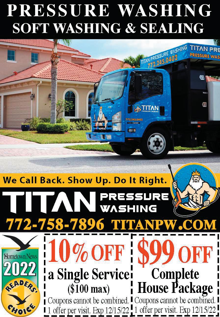 VOL. 560 G 49 Copyrighted© My Living Media. 2023 All Rights reserved. To Advertise call 772-247-6849 Need More Coupons - MyLivingMedia.com • Deck Coatings • Driveways • Carports • Pool Decks • Garage Floors • Patios Free Estimates No Job Too Big OR Too Small! Lic # MCA S3878 • LIc # St. Lucie Co. 11-11111 DESIGNER DRIVEWAYS • Seal Pavers • Exterior Floors • Walkways & Entryways 36 Years In Business! yourdesignerdriveway.com 772-878-8758 • 772-337-1088 $75 $150 OFF OFF SEALING PAVERS With this MLM Coupon. May not be combined with other offers. Exp. 3/3/23 With this MLM Coupon. May not be combined with other offers. Exp. 3/3/23 Min. 500 Sq.Ft. Any Concrete Cleaned ✓ ✓ Sealed Refinished ✓ ✓ BossPublicAdjusting.com Nader Anthony - Lic# P002749 This is a solicitation for business. If you have had a claim for an insured property loss or damage and you are satis ed with the payment by your insurer, you may disregard advertisement. YOUR DAMAGE MAY BE COVERED BY INSURANCE FREE FREE 10-POINT INSPECTION SPECIAL NO RECOVERY • NO FEE WE WILL GET YOU MONEY FOR REPAIRS GUARANTEED OR YOU DON’T PAY US A PENNY! PLUMBING LEAKS ROOF DAMAGE BROKEN WINDOWS FIRE MOLD FREE Policy claim and review BOSS Public Adjusting Commercial & Residential 772-444-8336 Treasure Coast 772-408-9009 Serving all of Martin & St. Lucie Counties Any New Hot Water Heater or Tankless Heater Any New Toilet Any New Garbage Disposal Clearing Any Sink, Toilet, or Main Sewer Line Your Next Service Call $65 OFF $35 OFF $30 OFF $37 OFF Not valid with other offers or prior services. Must present MLM coupon. Limit one coupon per service call. Not valid with other offers or prior services. Must present MLM coupon. Limit one coupon per service call. Not valid with other offers or prior services. Must present MLM coupon. Limit one coupon per service call. Not valid with other offers or prior services. Must present MLM coupon. Limit one coupon per service call. Not valid with other offers or prior services. Must present MLM coupon. Limit one coupon per service call. G G G G G Celebrating 40 Years of Excellence www.duallplumbers.com Lic. #CFC1429556 Any Job Big or Small We Do Them All! Available Nights, Weekends, & Holidays Plumbing Repairs & Water Heater Installations Senior Citizen & Veteran Discounts Available! $50 OFF