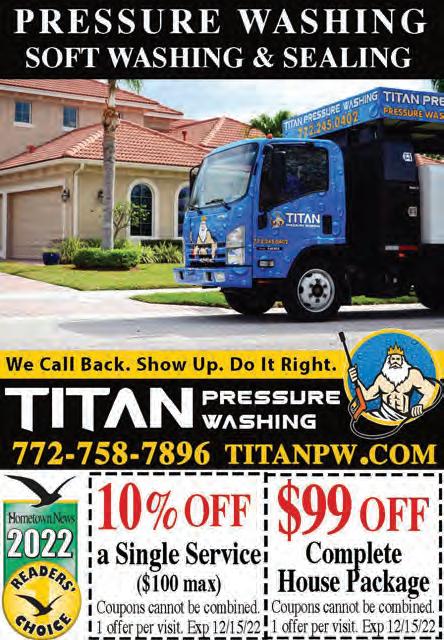 44 VOL. 564 G Copyrighted© My Living Media. 2023 All Rights reserved. To Advertise call 772-247-6849 Need More Coupons - MyLivingMedia.com Well Maid Cleaning Service, LLC email: wellmaidcleaningservice@gmail.com Call Tara Today! FREE Estimates 772.828.2741 • Weekly, Bi-Weekly, Monthly • Seasonal or One Time • Move In/Move Out • Affordable Rates • Trustworthy & Reliable • Residential & Commercial • References Available $ 20 OFF $150 Or More With this Ad. License & Insured Tara L. Walsh, Owner Well Maid Cleaning Service, LLC Accepted LIKE US ON FACEBOOK! We Have Gone GREEN! We now only use green, plant-based products. Services of NEED SHUTTERS THIS WEEK? Family Owned & Locally Manufactured Plantation Shutters & Motorized Shades Installed in as little as 7 Days • ANGLES & RAKES • ARCHES & SUNBURSTS • OTAGON, CIRCLE, HEXAGON • SILL COVERS & CAPS HORIZONTAL ARCH PLANTATION SHUTTERS SUNBURST PLANTATION SHUTTERS www.plantationshutters a.com Treasure Coast Palm Beach 772-600-4253 or 561-420-0418 Visit our manufacturing shop at: 406 Farmers Market Rd Ft Pierce, FL 34982 IN-HOME ESTIMATES FREE $1695 SQ. FT. INSTALLED Starting at We are the Real Manufacturer We Welcome Designers & Builders! Licensed & Insured CALL TODAY AND GET UP TO 10% DISCOUNT Restrictions may apply. Licensed & Insured Call Thomas, Martha & the Tomcat Team! 772-634-6104 • Trees Trimmed • Hazardous Tree and Limb Removal • Stump Grinding • Bush & Lot Clearing • Tractor and Excavator Work • Hauling & Disposal • 14ft. Roll-off Cans Available for Trash Serving the Treasure Coast 20% Off All Services up to $500 Expires 4/28/23 FREE ESTIMATES TOMCAT TREEWORK