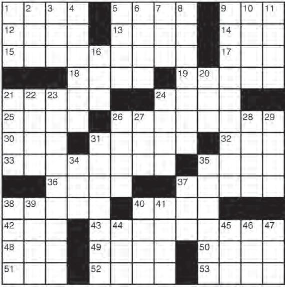 PUZZLE PAGE CROSSWORD ACROSS 1 Slightly wet 5 Wild canine 9 Yoga pad 12 Close 13 Actress Perlman 14 Green pre x 15 Requiring low temperatures 17 Moo -- pork 18 Boy, in Barcelona 19 Big name in racing 21 Antlered animals 24 Jubilation 25 Billions of years 26 German 30 Aachen article 31 Postpone 32 Wildebeest 33 Romance-free, as a relationship 35 Head, to Henri 36 Sweet wine 37 King of Judea 38 Snapshot 40 Graceful bird 42 Slithery sh 43 Looking good on the tube, say 48 Part of TNT 49 Lettuce unit 50 Turner or Fey 51 Billboards 52 Evergreens 53 Crisp cookie DOWN 1 Org. for a major party 2 -- Lingus 3 Spring month 4 Plug parts 5 Wee songbird 6 “It can’t be!” 7 Floral necklace 8 Teaching staff 9 Courier 10 Dull pain 11 Go sightseeing 16 USO patrons 20 Ultramodernist 21 Leak out slowly 22 Work hard 23 Maryland’s capital 24 Avocado dip, for short 26 Camp shelter 27 Peyton’s brother 28 Grooving on 29 Prompted 31 Girl in “The Wizard of Oz” 34 Nanny’s charge 35 Beliefs 37 Crone 38 Anti-fur org. 39 Cattle group 40 Cabbage salad 41 Marries 44 Shoe width 45 Diarist Anais 46 -- tizzy 47 Bottle top Solutions See Page 75