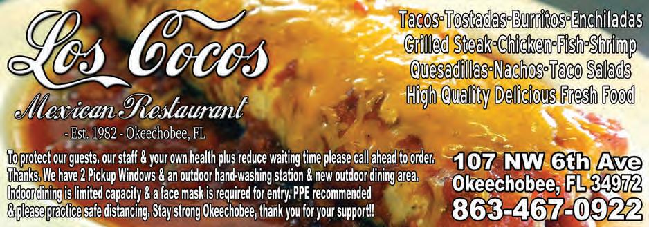 VOL. 565 J 21 Copyrighted© My Living Magazines. 2023 All Rights reserved. To Advertise call 863-623-3219 Need More Coupons - OkeechobeeLiving.com Family Mexican Restaurant at Affordable Prices! OPEN DAILY 11AM-10PM • WWW.PUEBLOVIEJOFL.COM OUR FAMILY SERVING YOUR FAMILY SINCE 1999! • Daily Specials • Beer, Wine, Sangria, & Margaritas 2 FOR l HAPPY HOUR All Day Every Day • Catering Available • Take Out Available May not be combined with other offers or specials. With this MLM coupon. Expires 4/30/23 $5 OFF Of $25 or More 863.357.9641 WE NOW OFFER ONLINE ORDERING 3415 US 441, Okeechobee “Let Us Cook For You!TM” FRESH SEAFOOD DISHES TO DELIGHT ANY APPETITE! OPEN LATE 863.357.0722 If Doors Are Open We Are Still Cookin’ 301 N PARROTT AVENUE OKEECHOBEE, FL PET-FRIENDLY PATIO NOW OPEN FULL SERVICE BAR & OUTDOOR SEATING Mon-Sat 11am-11:30 pm Sunday 11am-10:30 pm