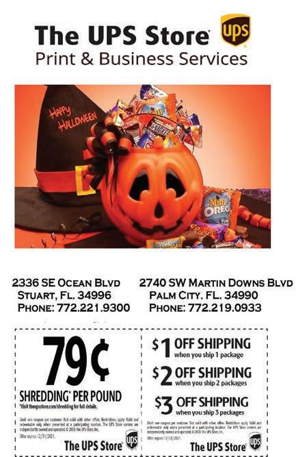 90 VOL. 552 M Copyrighted© My Living Media. 2022 All Rights reserved. To Advertise call 772-247-6849 Need More Coupons - MyLivingMedia.com Local English Tack Shop on the Treasure Coast Mon-Sat 9:00-6:00; Sun 10:00-3:00 4219 SW Martin Hwy, Palm City 772-444-8707 With MLM coupon. Expires 11/10/22 15%OFF With Mention of this ad $1OFF SHIPPING $2OFF SHIPPING $3OFF SHIPPING Limit one coupon per customer. Not valid with other offers. Restrictions apply. Valid and redeemable only when presented at a participating location, The UPS Store center are independently owned and operated. © 2018 The UPS Store, Inc. Offer expires 11/11/22 When you ship 1 package When you ship 2 packages When you ship 3 packages 2336 SE OCEAN BLVD STUART, FL. 34996 PHONE: 772.221.9300 2740 SW MARTIN D OWNS BLVD PALM CITY, FL. 34990 PHONE: 772.219.0933 ROOF REPAIR SPECIALIST • Structural Repair / Build Ups / Restoration • New Construction • Metal, Tile, Shingles, Etc. • Soffit & Fascia “Putting the Best Roof Over Your Head!” Bonded & Insured License CCC1330653 ALL WORK GUARANTEED Member of FREE ESTIMATES! 772-232-7305 www.TreasureCoastRoofing.net $100 OFF With this MLM Coupon Cannot be combined with any other offers. Expires 11/11/22 With this MLM Coupon Cannot be combined with any other offers. Expires 11/11/22 Any Roof Repair Over $500 $500 OFF Any Re-Roof