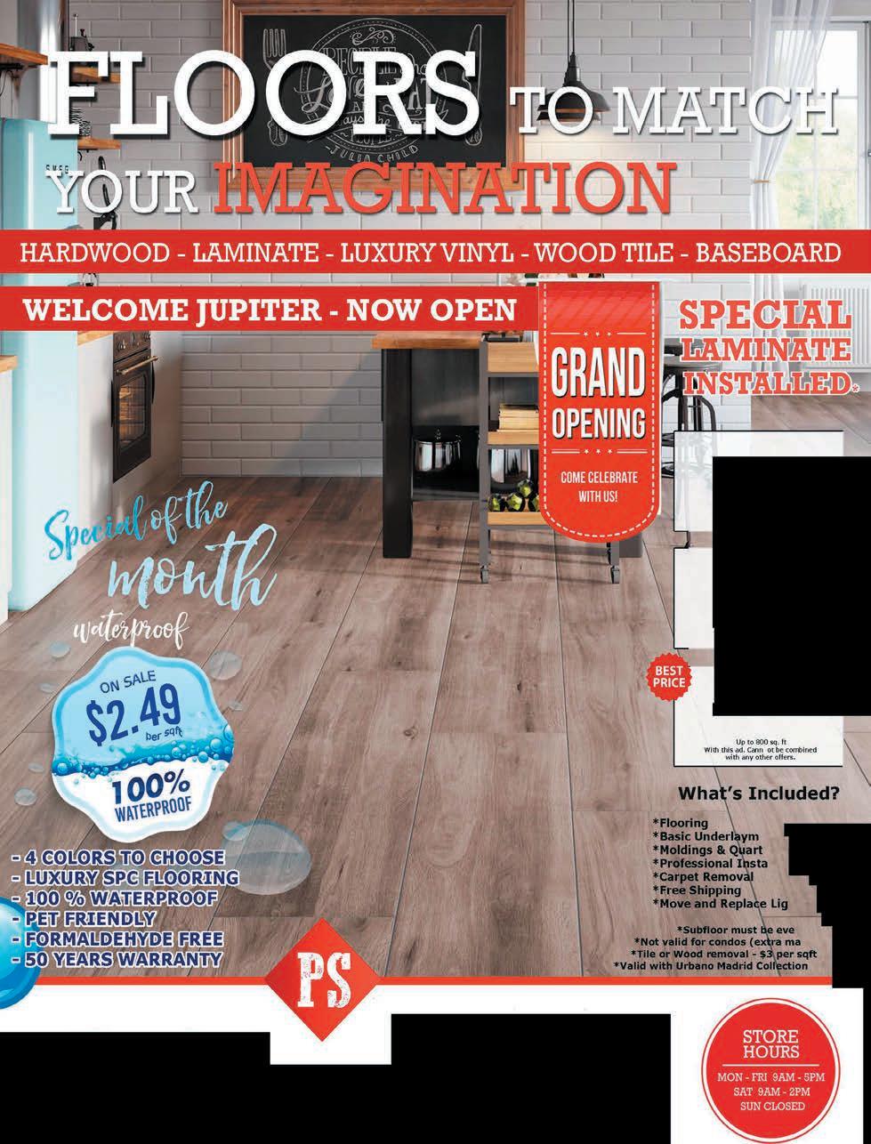Flouring Inc. WWW.PSFLOORINGUSA.COM (561) 612-4039 5Google stars Reviews ••••• FAMILY OWNED & OPER ATED 2 Rooms •999.oo Up to 260 sq. ft With thisad.Cannotbecombined with any other offers. 3 Rooms •1499.oo Up to 400 sq. ft With thisad.Cann otbecombined with any other offers. Whole House •2799.oo ent er Round llatlon ht Furniture n y apply) extra 8mm0nly VISIT OUR SHOWROOM OR CALL FOR A FREE IN HOME ESTIMATE NOW OPEN IN JUPITER 501 N ALTERNATE AlA JUPITER 33477 LAKEWORI'H 2110 N DIXIE HWY LAKEWORTH 33460 ROYAL PALM BEACH 8060 BELVEDERE RD SUITE 1&2 WEST PALM BEACH 33411 JUPITER 501 N ALTERNATE A1A NOW OPEN IN JENSEN BEACH 1683 NE JENSEN BEACH BLVD JENSEN BEACH 34957 LAKEWORTH 2110 N DIXIE HWY LAKE WORTH 33460 ROYAL PALM BEACH 8060 BELVEDERE RD SUITE 1&2 WEST PALM BEACH 33411