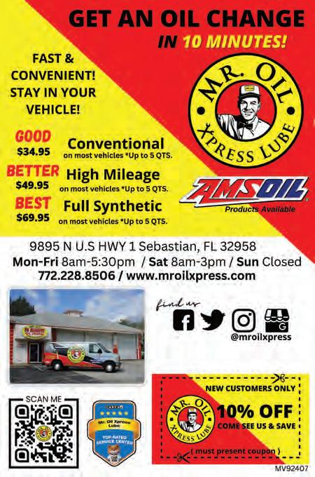 6 VOL. 564 T Copyrighted© My Living Media. 2023 All Rights reserved. To Advertise call 772-247-6849 Need More Coupons - MyLivingMedia.com CHRIS JUNKER Treasure Coast Specialist 772-571-4345 chrisjunker772@gmail.com Chris has sold over 500 homes! He is a member of the RE/MAX Platinum Club and RE/MAX Hall of Fame CALL NOW Helping You from Start to Finish! Crown Realty Main Headquarters: 2940 S. 25th Street Ft. Pierce FL WWW.ETELF.COM 772-277-7LAW (7529) $5000 Off $10000 Off A Will or Trust Package For A Single Person Expires 5/20/23 FREE UPCOMING SEMINARS Join us at one of our upcoming free educational seminars. Learn about Probate Avoidance, Estate and Trust Planning, Long Term Care Planning, Senior Exploitation, and more. e below seminars are o ered Live. FREE Estate Planning Consultation for “New Client” Seminar Attendees! RSVP TODAY! Serving Treasure Coast Seniors for Over 40 Years Thursday,August25that10am A Married Couple Expires 5/20/23 A Will or Trust Package For Wesley R. Harvin II, j.d., ll.m. Michael D. Fowler, j.d., ll.m., b.c.s Board Certified Elder Law Attorney Of-Counsel Thursday,April20th 10:00am-12:00pm IRSC Schreiber Conference Center 500 NW California Blvd. Port St. Lucie, FL Thursday,April13th 10:00am-12:00pm The River Chamber of Commerce 1216 21st Street Vero Beach, FL FREE SERVICE CALL WITH ANY REPAIR $1000 *With this Ad, Expires 4/30/23 *With this Ad, Expires 4/30/23 *With this Ad, Expires 4/30/23 A NEW SYSTEM WITH REBATES! UP TO We Service & Offer All Brands of A/C Units Residential & Commercial A/C Repair, Inspection, & Service HVAC Ducts, Metal Ducts, UV Lights, & More Financing Options Available Senior & Military Discounts Available Call Today for our Specials on Duct Cleaning & Dryer Vent Cleaning! $5995 COMPLETE A/C CHECKUP Drain Flush Included 772-934-99AC www.ImacculateAirInc.com RA# 13067619 FOLLOW US (9922) OFF Subject to credit approval, see store for details. SAVE $ WITH A HIGH EFFICIENCY A/C SYSTEM! Protect The Air you’re Breathing in your Home: FREE Bacteria-Killing UV Light with any NEW Installation or Sanitize your Current Air Conditioning System with a UV Light and Air Duct Sanitization SAME DAY SERVICE!
