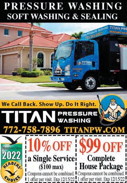 VOL. 564 V 39 Copyrighted© My Living Media. 2023 All Rights reserved. To Advertise call 772-247-6849 Need More Coupons - MyLivingMedia.com QUALITY PAINTING & RESURFACING 772-758-1762 QUALITYPAINTINGANDRESURFACING.COM $250 OFF $2,250 GARAGE FLOOR FLAKE SYSTEM ANY $1000 JOB PAINTING CONCRETE EPOXY (up to 600 Sq. ft. & doesn’t include crack repair) With MLM coupon With MLM coupon • Banks • Of ces • Auto Dealers • Carpets/Floors • Medical Health Care Facilities • Property Management Commercial Cleaning Services NOBODY LIKES A DIRTY OFFICE We‛ll keep yours clean so you can stick to business • Religious Facilities • Government Buildings • Move In/Move Out A am’s CLEANING SERVICE LLC 772-261-9550 FREE ESTIMATES 20% off First Cleaning With this MLM Coupon. Expires 4/30/23 NEED SHUTTERS THIS WEEK? Family Owned & Locally Manufactured Plantation Shutters & Motorized Shades Installed in as little as 7 Days • ANGLES & RAKES • ARCHES & SUNBURSTS • OTAGON, CIRCLE, HEXAGON • SILL COVERS & CAPS HORIZONTAL ARCH PLANTATION SHUTTERS SUNBURST PLANTATION SHUTTERS www.plantationshutters a.com Treasure Coast Palm Beach 772-600-4253 or 561-420-0418 Visit our manufacturing shop at: 406 Farmers Market Rd Ft Pierce, FL 34982 IN-HOME ESTIMATES FREE $1695 SQ. FT. INSTALLED Starting at We are the Real Manufacturer We Welcome Designers & Builders! Licensed & Insured CALL TODAY AND GET UP TO 10% DISCOUNT Restrictions may apply.