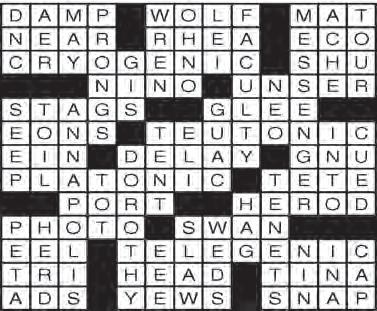 PUZZLE PAGE CROSSWORD ACROSS 1 Slightly wet 5 Wild canine 9 Yoga pad 12 Close 13 Actress Perlman 14 Green pre x 15 Requiring low temperatures 17 Moo -- pork 18 Boy, in Barcelona 19 Big name in racing 21 Antlered animals 24 Jubilation 25 Billions of years 26 German 30 Aachen article 31 Postpone 32 Wildebeest 33 Romance-free, as a relationship 35 Head, to Henri 36 Sweet wine 37 King of Judea 38 Snapshot 40 Graceful bird 42 Slithery sh 43 Looking good on the tube, say 48 Part of TNT 49 Lettuce unit 50 Turner or Fey 51 Billboards 52 Evergreens 53 Crisp cookie DOWN 1 Org. for a major party 2 -- Lingus 3 Spring month 4 Plug parts 5 Wee songbird 6 “It can’t be!” 7 Floral necklace 8 Teaching staff 9 Courier 10 Dull pain 11 Go sightseeing 16 USO patrons 20 Ultramodernist 21 Leak out slowly 22 Work hard 23 Maryland’s capital 24 Avocado dip, for short 26 Camp shelter 27 Peyton’s brother 28 Grooving on 29 Prompted 31 Girl in “The Wizard of Oz” 34 Nanny’s charge 35 Beliefs 37 Crone 38 Anti-fur org. 39 Cattle group 40 Cabbage salad 41 Marries 44 Shoe width 45 Diarist Anais 46 -- tizzy 47 Bottle top Solutions See Page 70