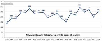Alligators are observed using spotlights and placed into categories based on their estimated length. A series of formulas are then used to generate an estimated density of alligators on the island. The graph shows the estimated density of alligators per 100 acres on Kiawah Island beginning in 2003. Despite some minor fluctuations, Kiawah’s alligator population has remained stable over the last 15 years.