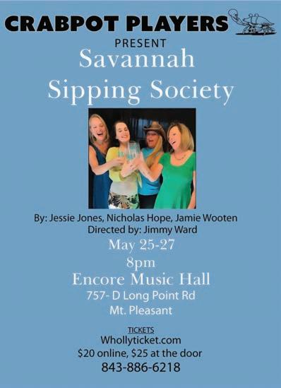 The Crabpot Players Theater Company will present the Southern comedy, “Savannah Sipping Society,” by Jessie Jones, Nicholas Hope and Jamie Wooten May 25 through May 27. The performance is planned for 8 p.m. at Encore Music Hall, 757-D Long Point Road in Mount Pleasant.