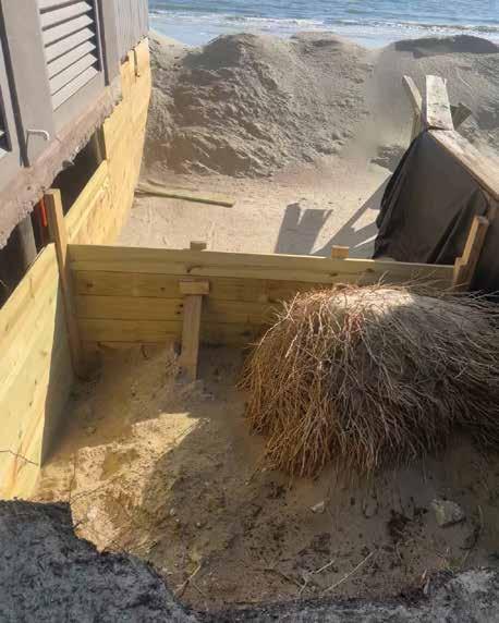 One solution the Bernsteins see for countering erosion is “large rocks and boulders,” pointing to their neighbors’ properties about 150 yards south of them. This rock, sand and vegetation dune was built by special permit in 1983 and has been enough to maintain a backyard for those homes. While recent storms washed away sand and vegetation on top, the homes remain relatively safe, while the waves continue to strike unprotected properties.