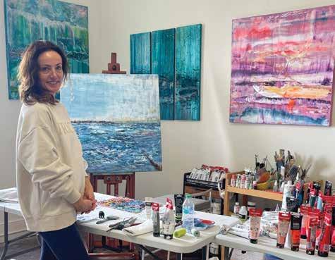 ist working between South Carolina and Florida, creates dynamic compositions using acrylics and mixed media, often applying unique tools to canvas, wood, and recycled surfboards. Her creative process is inspired by the sights, sounds, and rhythms of the ocean, as well as her life experiences as a published author, speaker, TV host, interior designer, global disability consultant, and a wife and mother of two women, one of whom is disabled. Her work is often characterized by textured surfaces and a bold visual language, creating compositions with depth, variation, and visual strength that convey resilience and forward momentum. Vogel’s art is featured at Hagan Fine Art in Charleston and at galleries across Florida.