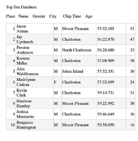 The top female finisher was Madelynne Cadeau of Charleston, who placed sixth overall with a time of 57:52.699.