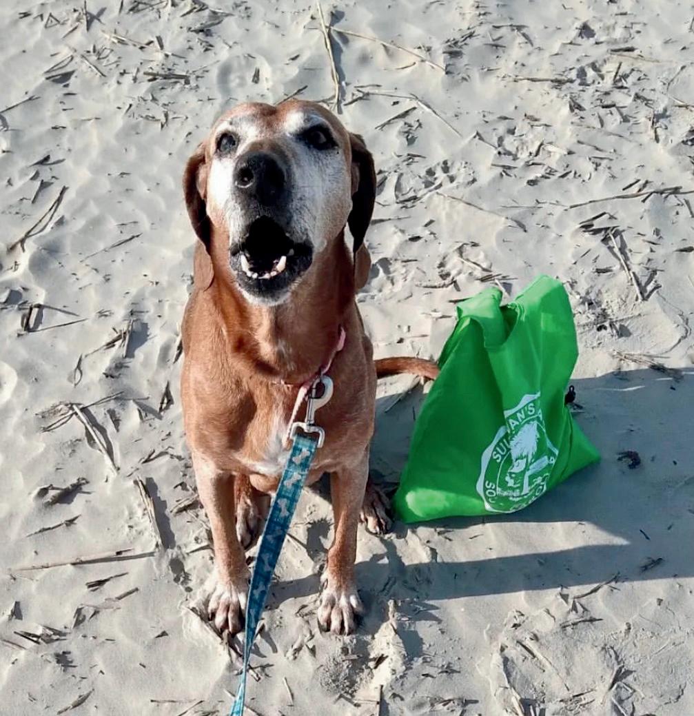 Hi everyone, I’m Elvis, the best internet date my dad ever had! A big name got bigger the day I barked my way into the world. It started ‘ruff’ when my family was attacked. That sucked. I survived, but the jerk left me blind in one eye. I see everything and make up for it with my bark. My voice is heard far and wide! I’m often told that people can hear me coming before I arrive. I am more than your average hound dog; I am my own adjective. I’m smart as a tack, however, that doesn’t mean I’ll listen. I don’t argue with my daily walks on the beach with Dad though. It’s my favorite. All my friends are there, and every day reveals a new adventure. Dad and I started @Elvis_Saves_Sullivans on Instagram, where we encourage others to help clean up the crap left on our beaches.