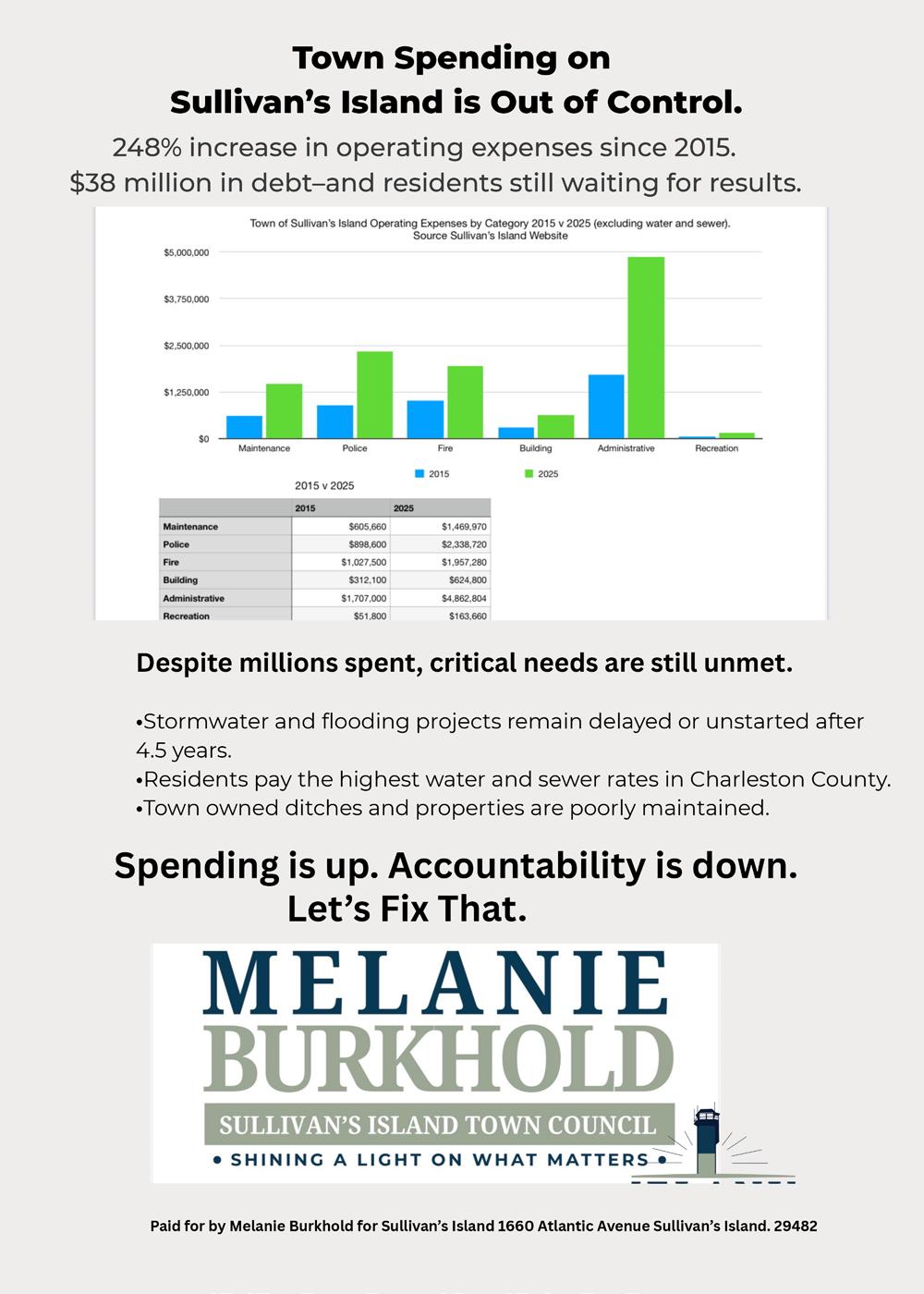 I and other residents are concerned about the Town of Sullivan’s Island’s financial trajectory. With $38 million in bond debt and more than $11 million in annual expenditures, it’s clear we are not in a position of stability or strength. Council may claim the Moody’s ratings reflect sound management, ignoring that a strong residential tax base is the main driver. This level of indebtedness, combined with spending on unnecessary and costly nonessentials, is unsustainable for a small, unchanging population like ours and risks burdening us—or future generations—with higher taxes or reduced services.