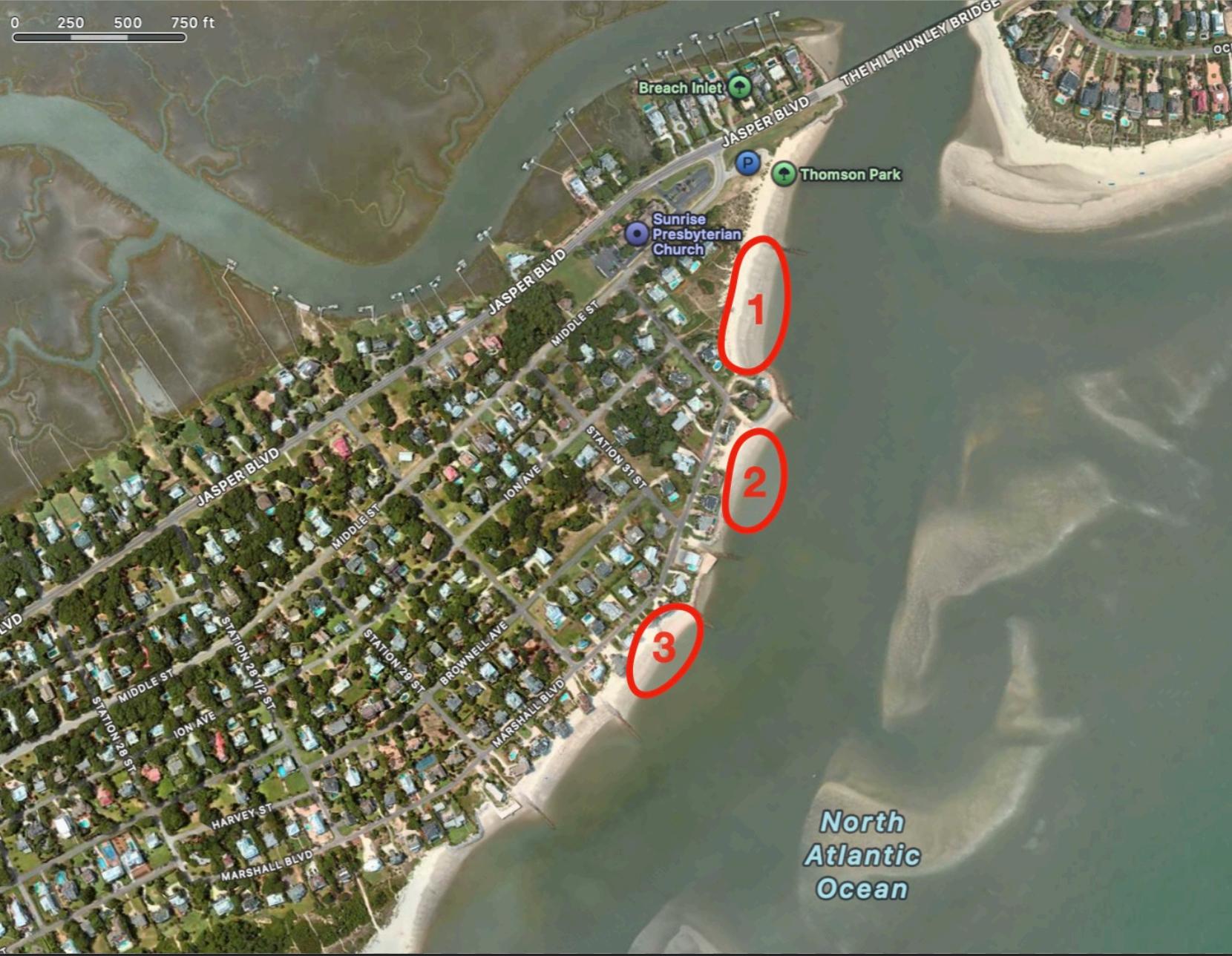 The sand placement will occur sequentially in three piles along the lower intertidal beach the area exposed during low tide and submerged during high tide Approximately 200,000 cubic yards of sand will be placed near Breach Inlet, with between 50,000 and 75,000 cubic yards in stockpile one, 75,000 cubic yards in stockpile two, and the remainder in stockpile three.
