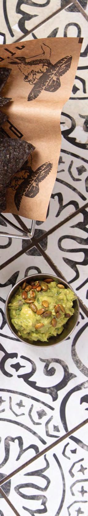 And it’s this very personal taco that brings Hamlin’s New Orleans air to his menu of fusion eats. e How Ya Durin is the taco version of a traditional, Louisiana-style shimp po boy, with fried shrimp, pickled chayote, cabbage, red onion and house-made remoulade all tucked inside a tortilla by Mitla, a local tortilleria that worked with Hamlin to create a custom Papi’s recipe.