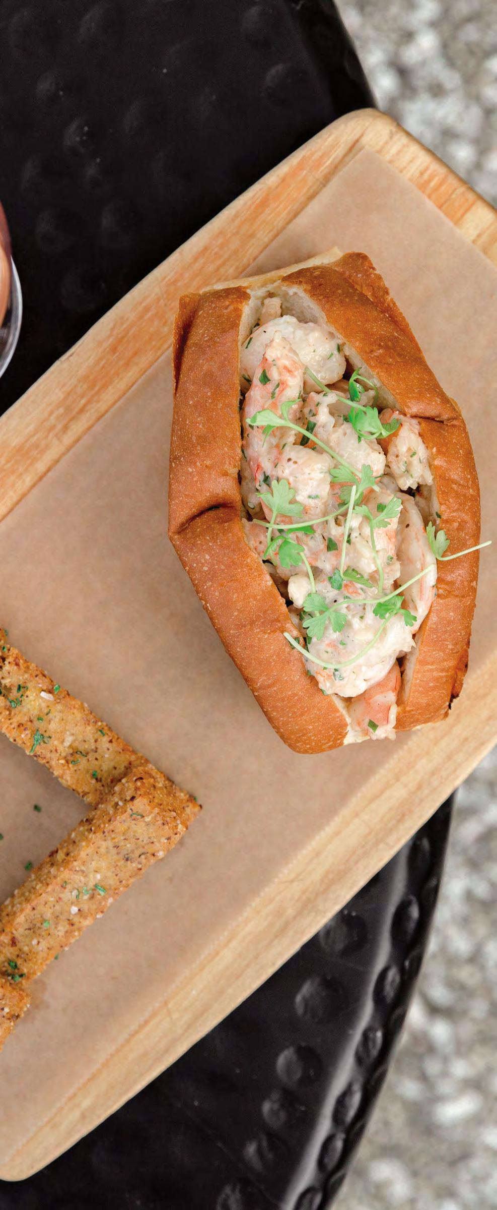 e shrimp can be found in a variety of items on the menu, but one of the favorites is the Lowcountry Shrimp Roll, a twist on a traditional lobster roll. “We pair it with the Geechie Frites, which are fried polenta sticks that come from Geechie Boy Mill, and the bread is coming from Normandy Farms, so it’s hyper-local and highlights the good stu that we have in the area,” says Fincher.