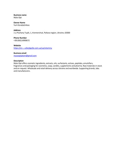 Mylo Opt offers cosmetic ingredients, extracts, oils, surfactants, actives, peptides, emulsifiers, fragrances and packaging for cosmetics, soap, candles, supplements and pharma. Raw materials in stock and on request. Wholesale and retail delivery across Ukraine and worldwide. Supporting brands, labs and manufacturers.