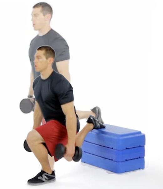 Stand facing away from a box or bench, holding dumbbells at your sides. Place one foot on the box behind you. Lower your body until your forward thigh is parallel to the ground. Push through the front heel to return to the starting position. Repeat 10 times on each leg.