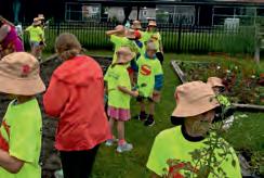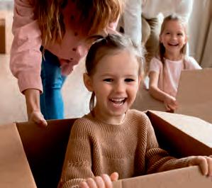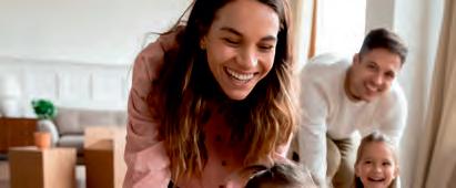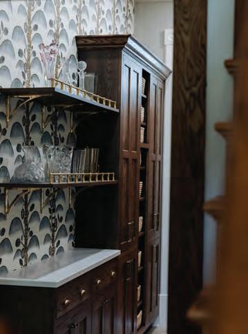 To balance the light, a moody powder room with deep purple floral wallpaper and sculptural black marble sink greets visitors. An adjacent cozy library stretches upward with floorto-ceiling bookshelves. The homeowner was ready to experiment with color, being pulled toward dark, bold, funky hues. Throughout the home,