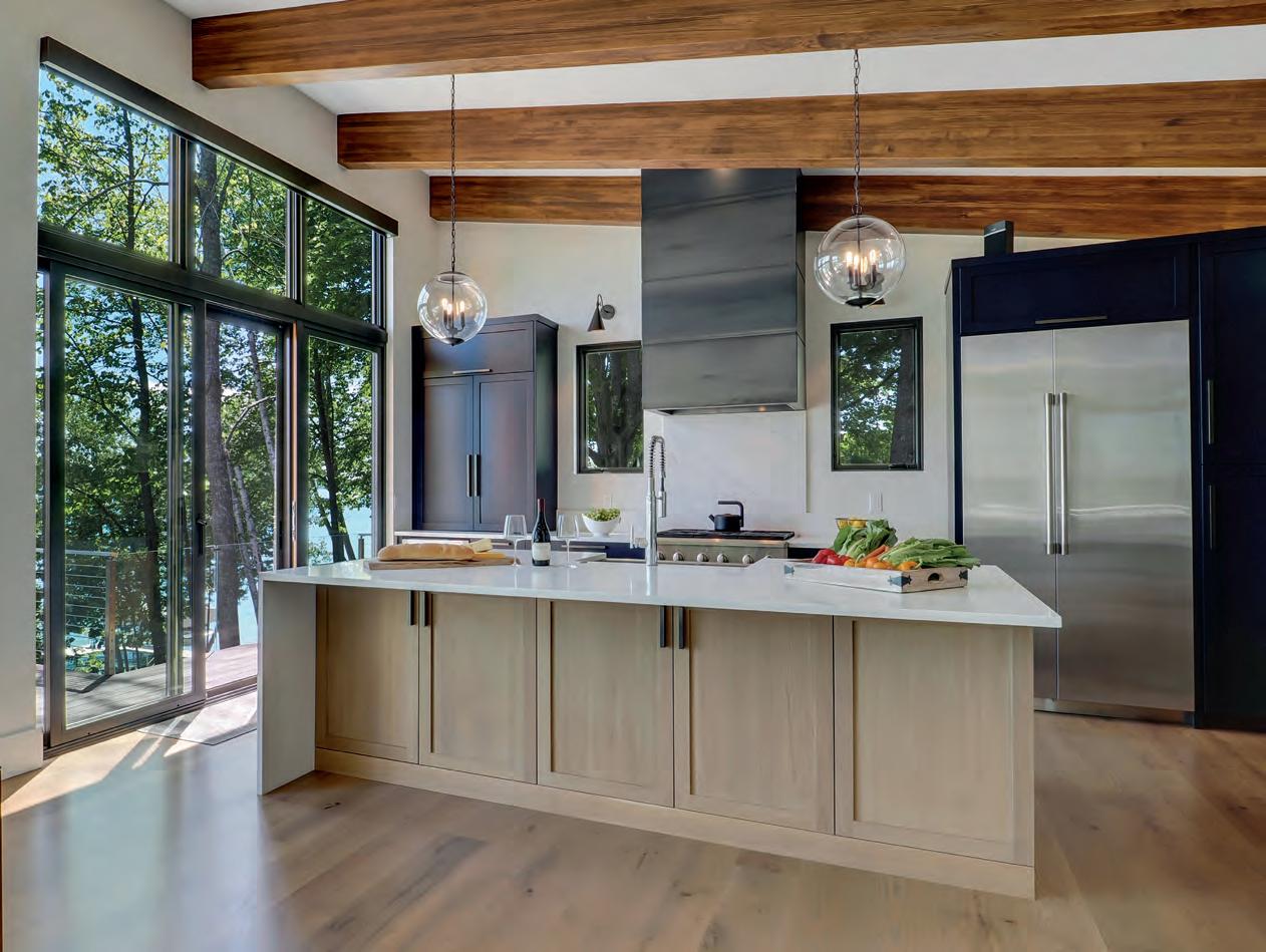 One of Moseyâs guiding concepts was scale. On approach up the driveway, the house remains intentionally modest, with low-pitched rooflines and a petite one-car garage. But once inside, cue the drama. From a small, compact entryway, the living room lifts off toward Torch Lake, thanks to a ceiling that rises to 14 feet, 6 inches. A towering wall of glassâ8-foot picture windows topped by 3-foot transomsâframes the lake as a living painting. âThe house grabs onto the view and pulls it inside,â says Mosey. âIt makes the home feel much bigger than it really is.â