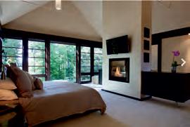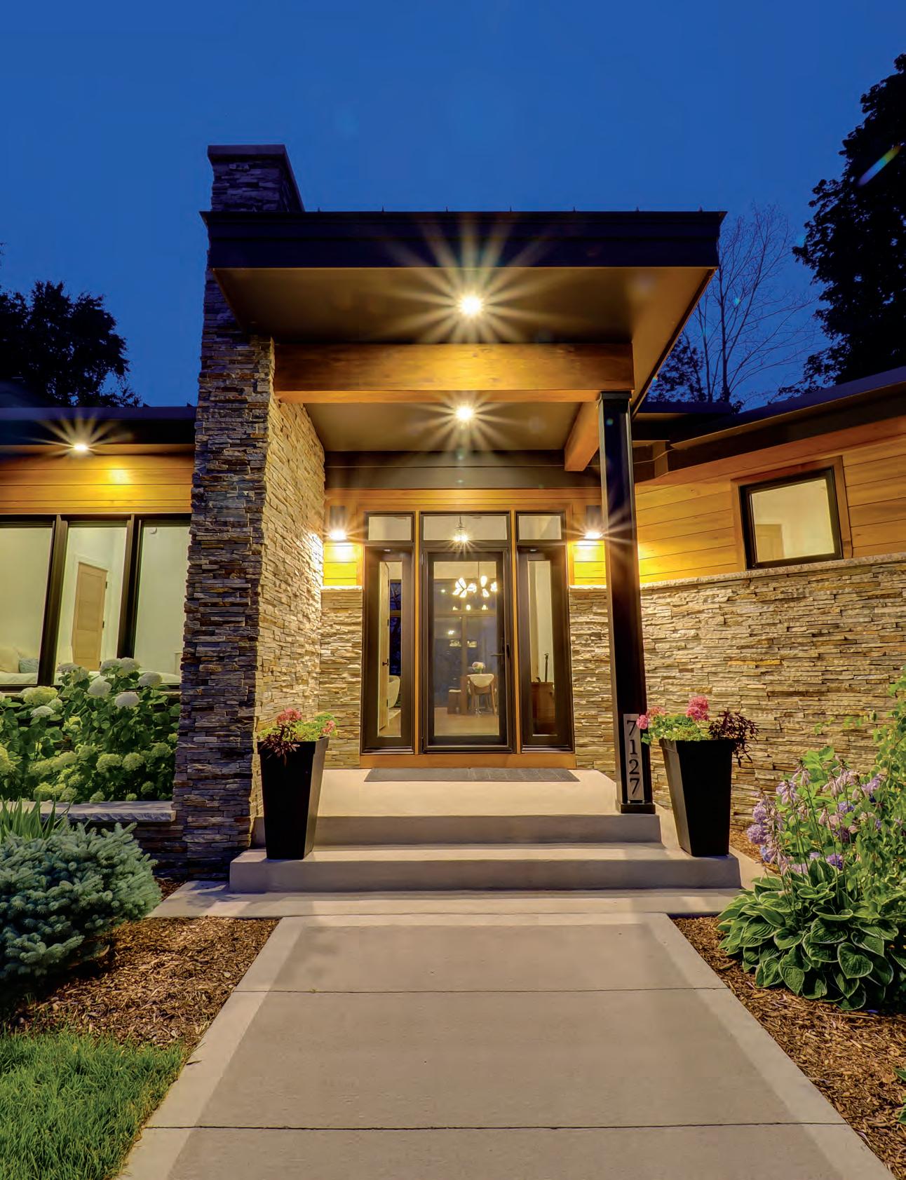 Despite its modern silhouette, the 2,100-square-foot home feels cozy and grounded. Its dark-brown metal roof and stained cedar siding fit the natural surroundings, along with the stoneâ âa little nod to Uncle Frank [Lloyd Wright],â notes Moseyâaccenting the foundation, front porch and fireplace. The linear-gas fireplace is especially welcome in the colder months. Wrapped in sheets of patinaed steel, it features an I-beam mantle salvaged from the original cottage, all fabricated and installed by builder Mapleridge. Says co-owner Scott Naumes: âWe enjoy doing that kind of not-your-