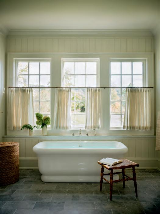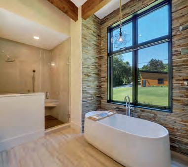 Left: Materials from the rest of the houseânatural stone, ceiling beamsâlend warmth and texture to the primary bathroom.