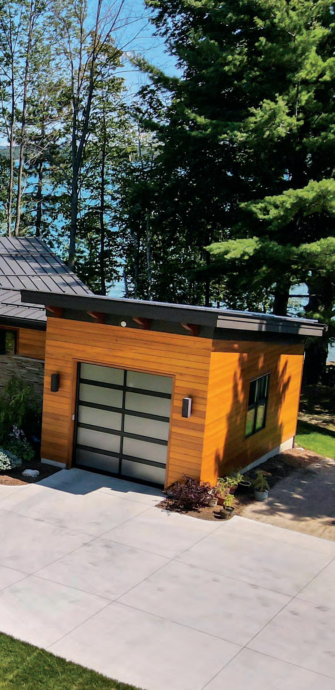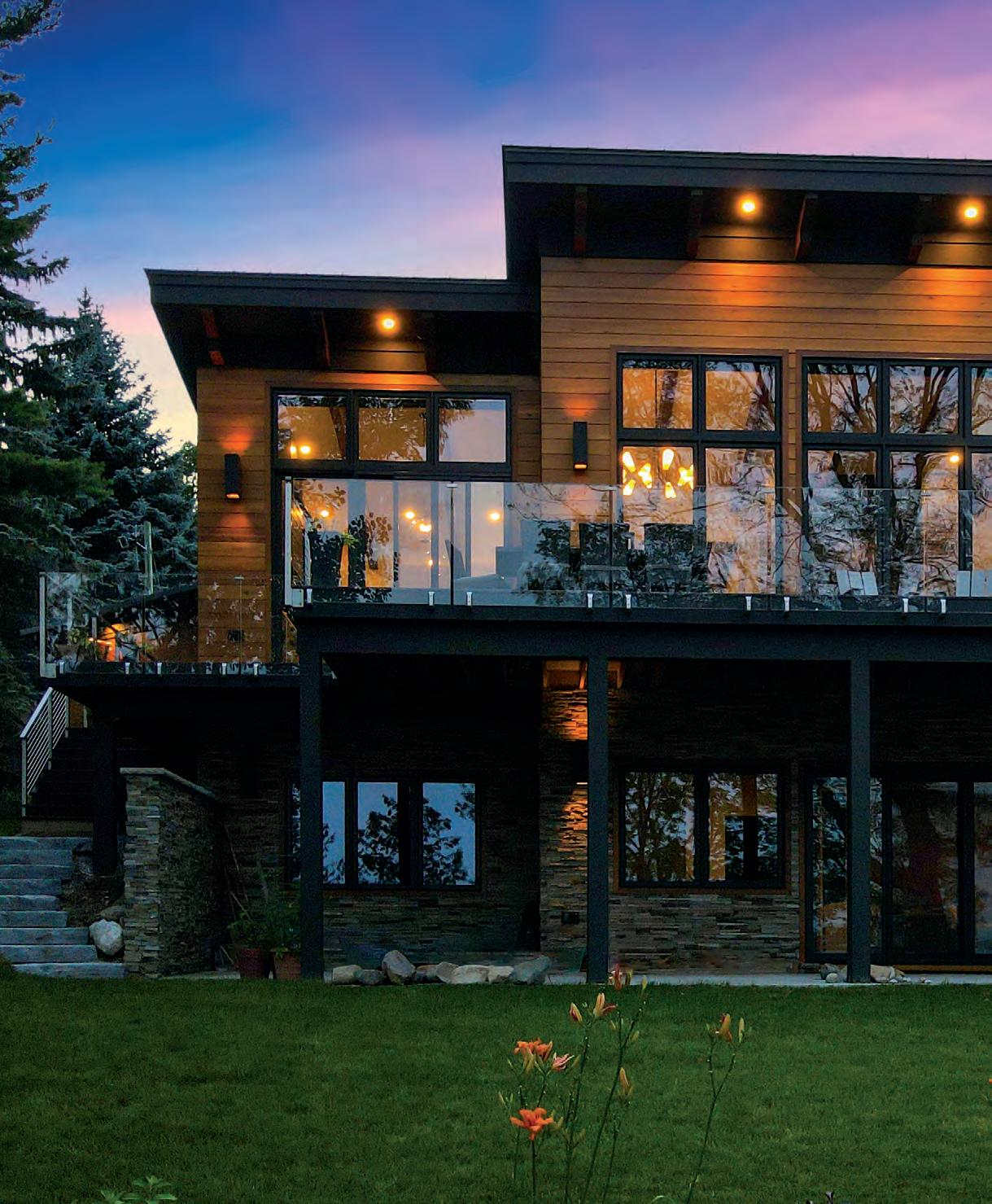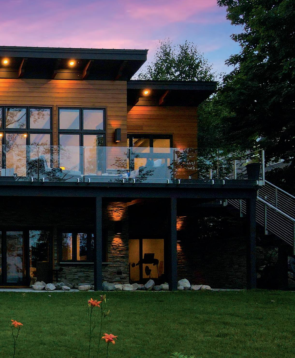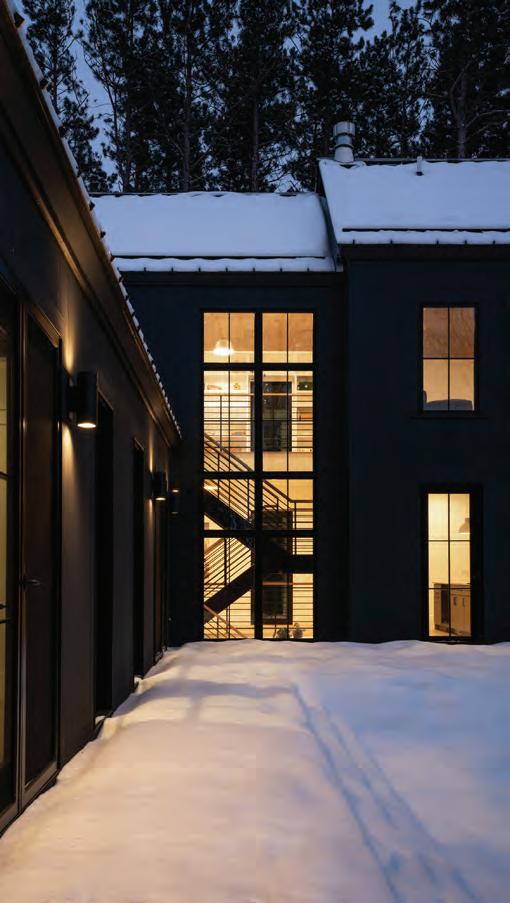 The result is a home thatâs stylish and welcoming. The monoslope metal roof, wide overhangs and stacked-box forms give it a modern character, while the cedar, oak, and stone keep it connected to the landscape. A walkout lower level offers a bunk room, perfect for extended family on snowy winter weekends.