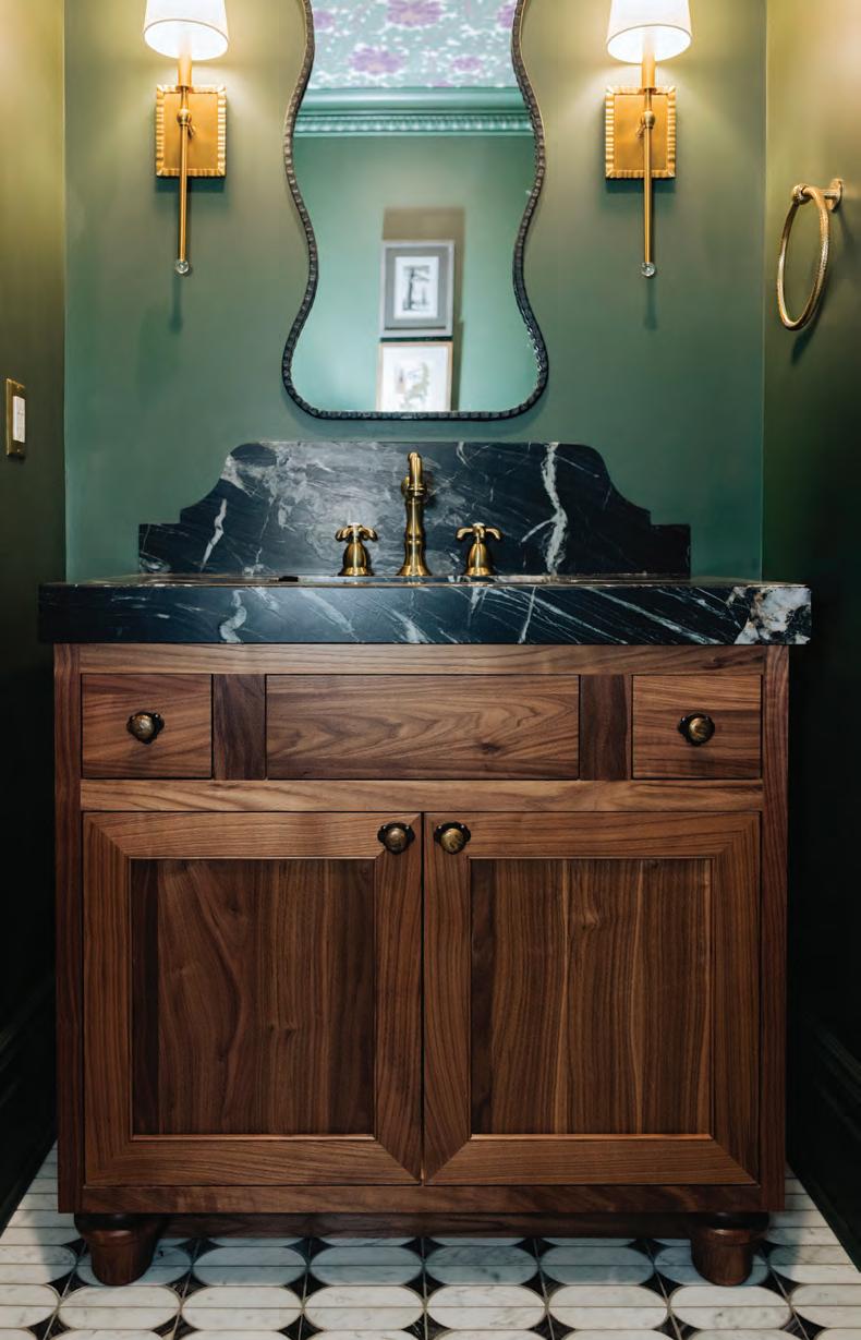 The dark green in the powder room is a nod to nearby Northern Michigan University, whose colors are green and gold.