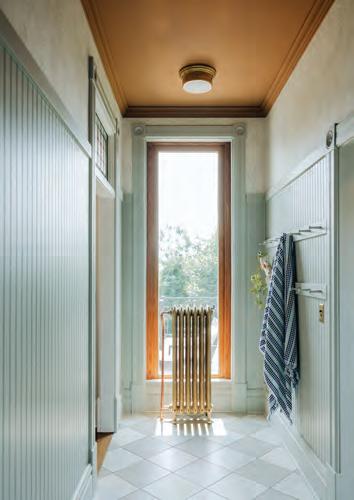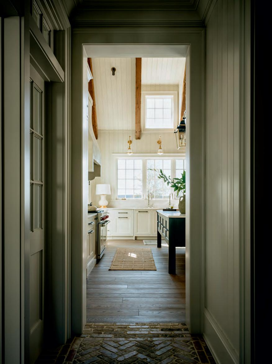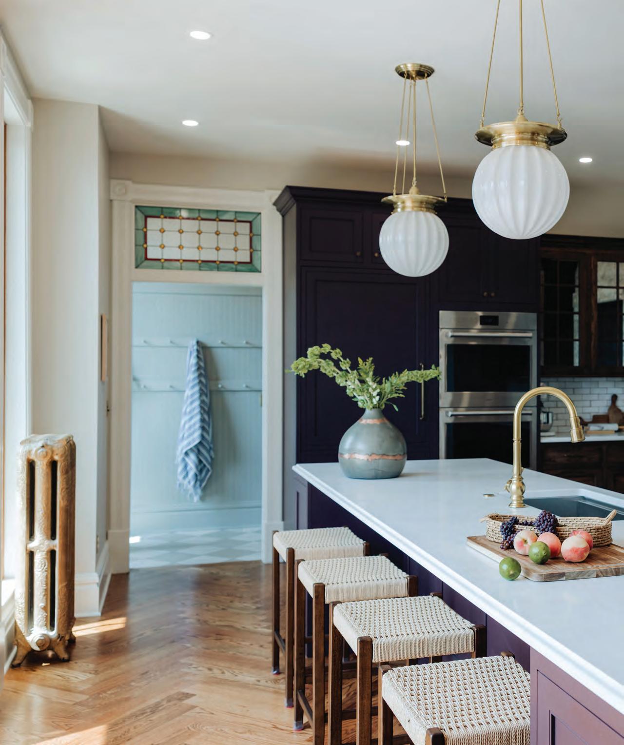 The renovation honors the homeâs story while elevating it into something polished. One of Harlowâs favorite touches is the custom glass transoms above the pantry and the mudroom doors. âI wanted people to walk through the home and question what was here originally,â says Harlow. Even the light switches whisper historyâmother-of-pearl push buttons set in unlacquered brass. âYou donât always get a client who cares that much for the little details. Thatâs fifty dollars more for a switch and plate cover, but it feels like it belongs, and the house is really deserving of that.â