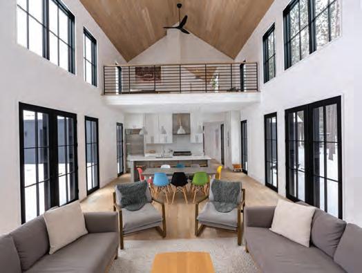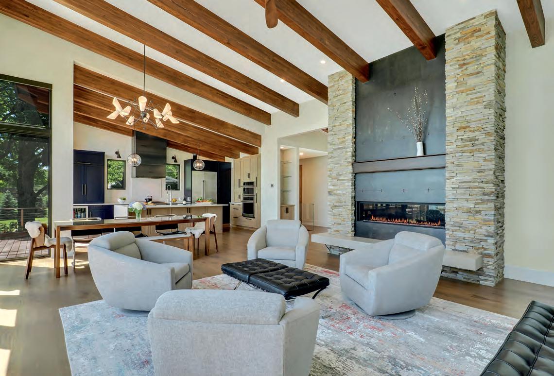 Above: The fireplace surround, made of fabricated steel, was accented by antique-looking fasteners and patinaed by skilled painters. The rhythm of stained, structural ceiling beams unites the main living space.